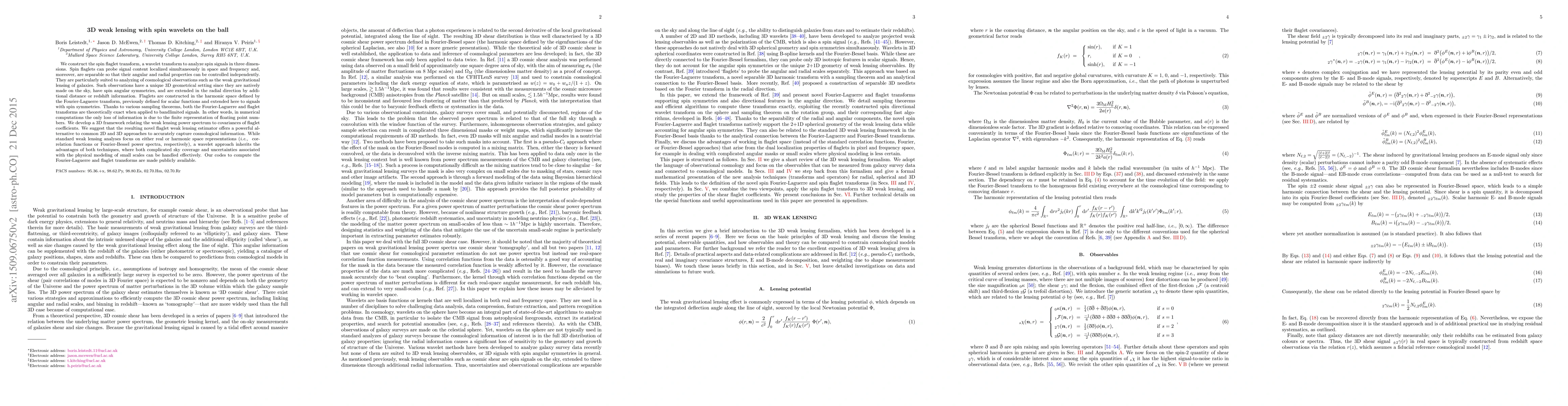 We construct the spin flaglet transform, a wavelet transform to analyze spin signals in three dimensions. Spin flaglets can probe signal content localized simultaneously in space and frequency and, moreover, are separable so that their angular and radial properties can be controlled independently. They are particularly suited to analyzing of cosmological observations such as the weak gravitational lensing of galaxies. Such observations have a unique 3D geometrical setting since they are natively made on the sky, have spin angular symmetries, and are extended in the radial direction by additional distance or redshift information. Flaglets are constructed in the harmonic space defined by the Fourier-Laguerre transform, previously defined for scalar functions and extended here to signals with spin symmetries. Thanks to various sampling theorems, both the Fourier-Laguerre and flaglet transforms are theoretically exact when applied to bandlimited signals. In other words, in numerical computations the only loss of information is due to the finite representation of floating point numbers. We develop a 3D framework relating the weak lensing power spectrum to covariances of flaglet coefficients. We suggest that the resulting novel flaglet weak lensing estimator offers a powerful alternative to common 2D and 3D approaches to accurately capture cosmological information. While standard weak lensing analyses focus on either real or harmonic space representations (i.e., correlation functions or Fourier-Bessel power spectra, respectively), a wavelet approach inherits the advantages of both techniques, where both complicated sky coverage and uncertainties associated with the physical modeling of small scales can be handled effectively. Our codes to compute the Fourier-Laguerre and flaglet transforms are made publicly available.