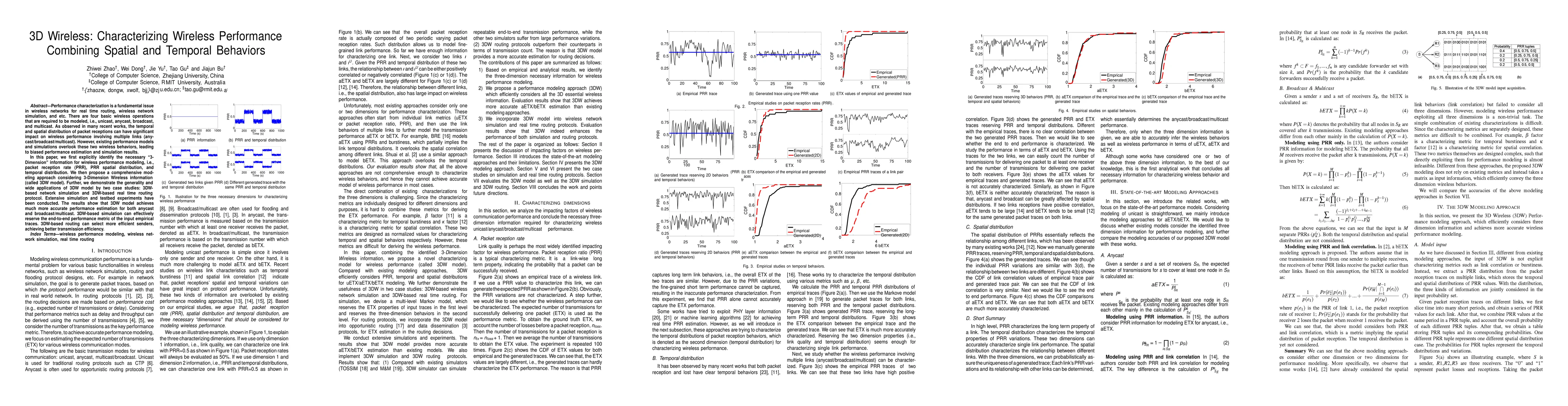 This paper proposes a comprehensive "3DW model" for wireless performance modeling by incorporating spatial and temporal behaviors, addressing the limitations of existing models. The 3DW model considers packet reception rate, spatial distribution, and temporal distribution, demonstrating improved accuracy in simulations and real-time routing protocols.