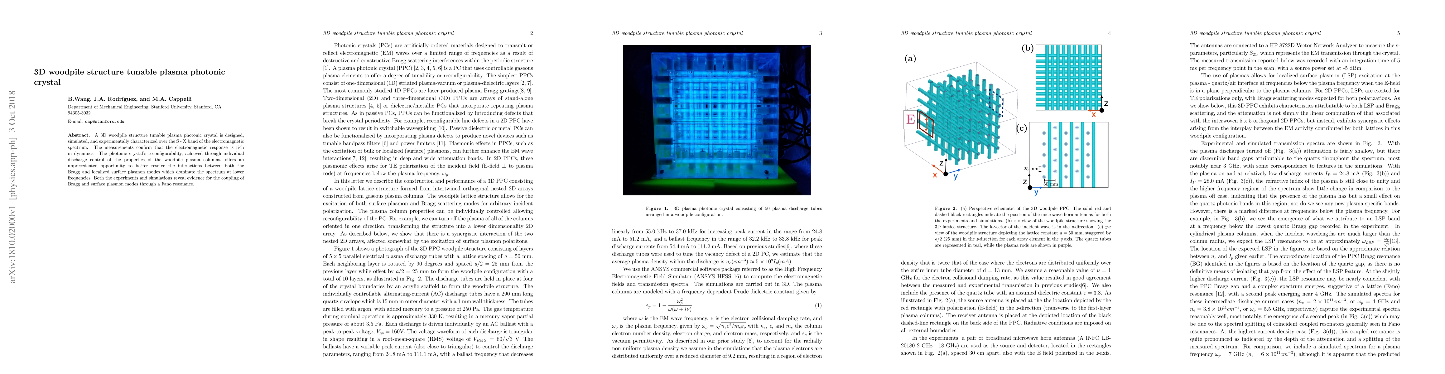 A 3D woodpile structure tunable plasma photonic crystal is designed, simulated, and experimentally characterized over the S - X band of the electromagnetic spectrum. The measurements confirm that the electromagnetic response is rich in dynamics. The photonic crystal's reconfigurability, achieved through individual discharge control of the properties of the woodpile plasma columns, offers an unprecedented opportunity to better resolve the interactions between both the Bragg and localized surface plasmon modes which dominate the spectrum at lower frequencies. Both the experiments and simulations reveal evidence for the coupling of Bragg and surface plasmon modes through a Fano resonance.