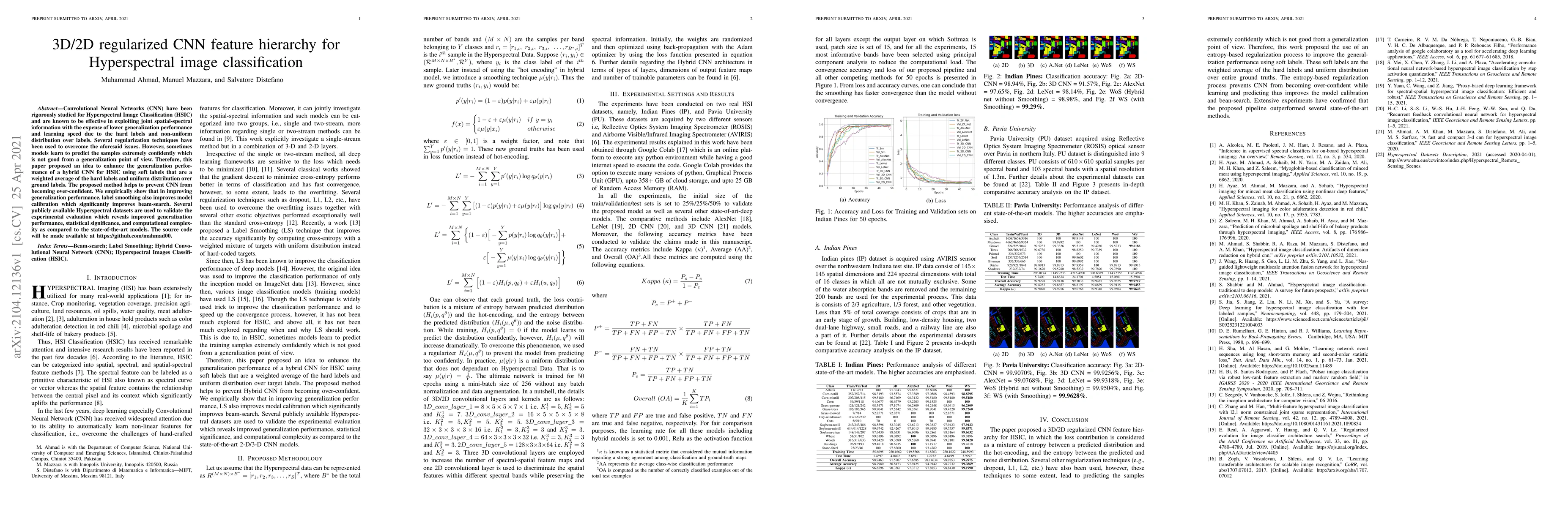 Convolutional Neural Networks (CNN) have been rigorously studied for Hyperspectral Image Classification (HSIC) and are known to be effective in exploiting joint spatial-spectral information with the expense of lower generalization performance and learning speed due to the hard labels and non-uniform distribution over labels. Several regularization techniques have been used to overcome the aforesaid issues. However, sometimes models learn to predict the samples extremely confidently which is not good from a generalization point of view. Therefore, this paper proposed an idea to enhance the generalization performance of a hybrid CNN for HSIC using soft labels that are a weighted average of the hard labels and uniform distribution over ground labels. The proposed method helps to prevent CNN from becoming over-confident. We empirically show that in improving generalization performance, label smoothing also improves model calibration which significantly improves beam-search. Several publicly available Hyperspectral datasets are used to validate the experimental evaluation which reveals improved generalization performance, statistical significance, and computational complexity as compared to the state-of-the-art models. The code will be made available at https://github.com/mahmad00.