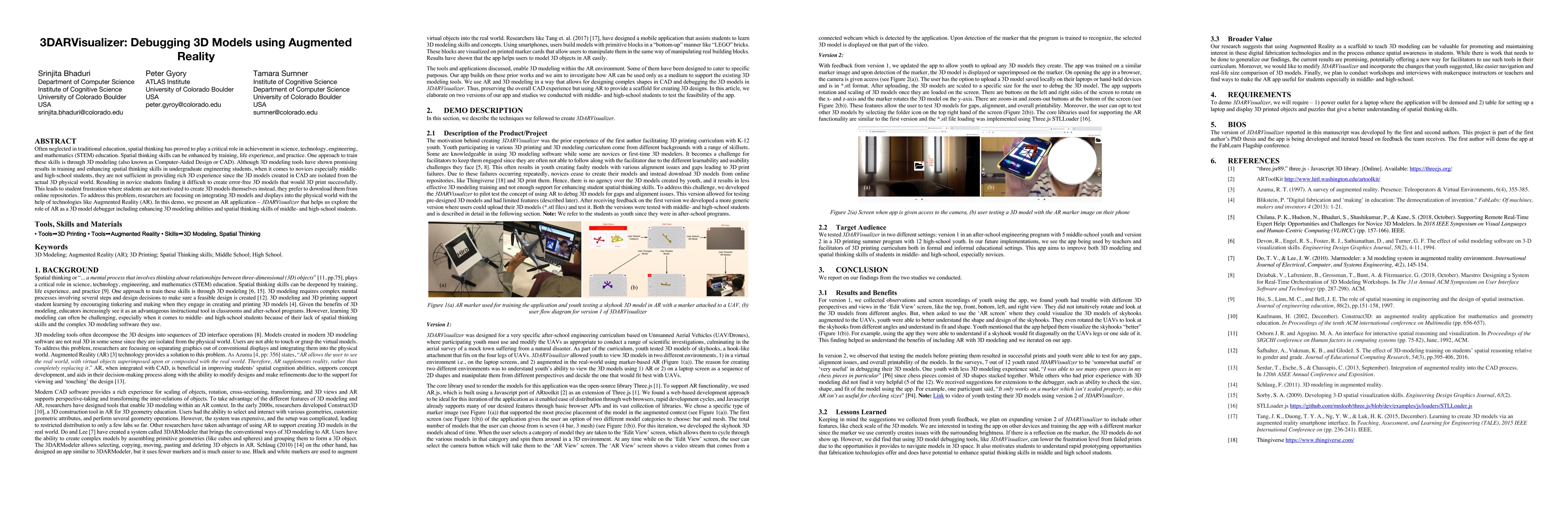 Often neglected in traditional education, spatial thinking has played a critical role in science, technology, engineering, and mathematics (STEM) education. Spatial thinking skills can be enhanced by training, life experience, and practice. One approach to train these skills is through 3D modeling (also known as Computer-Aided Design or CAD). Although 3D modeling tools have shown promising results in training and enhancing spatial thinking skills in undergraduate engineering students when it comes to novices, especially middle and high-school students, they are not sufficient to provide rich 3D experience since the 3D models created in CAD are isolated the actual 3D physical world. Resulting in novice students finding it difficult to create error-free 3D models that would 3D print successfully. This leads to student frustration where students are not motivated to create 3D models themselves; instead, they prefer to download them from online repositories. To address this problem, researchers are focusing on integrating 3D models and displays into the physical world with the help of technologies like Augmented Reality (AR). In this demo, we present an AR application, 3DARVisualizer, that helps us explore the role of AR as a 3D model debugger, including enhancing 3D modeling abilities and spatial thinking skills of middle- and high-school students.