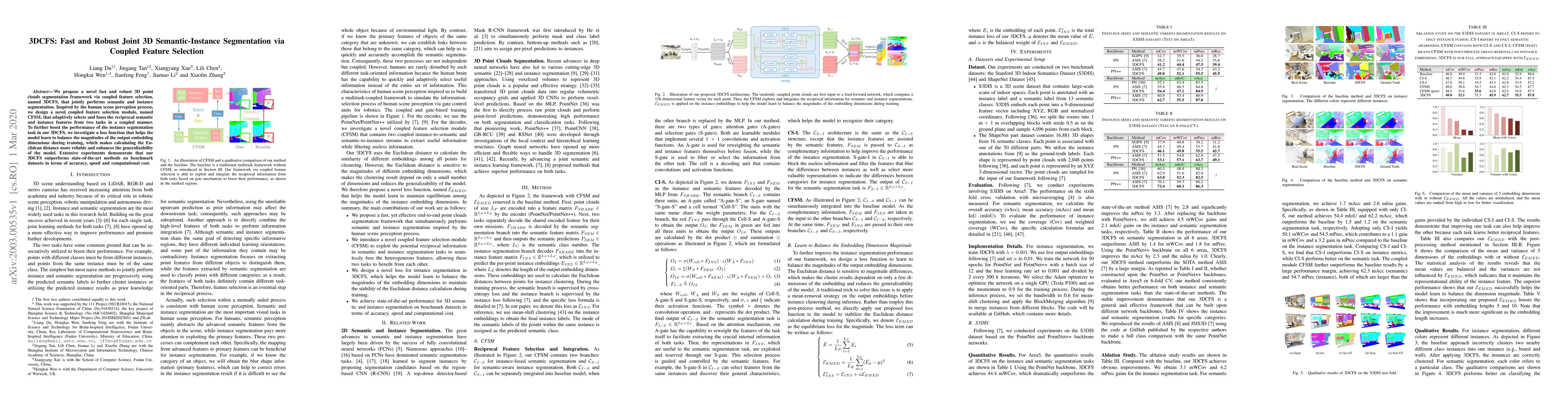A new method called 3DCFS improves 3D point cloud segmentation by adaptively selecting features from two tasks to enhance accuracy, speed, and computational cost. It outperforms state-of-the-art methods on benchmark datasets.
