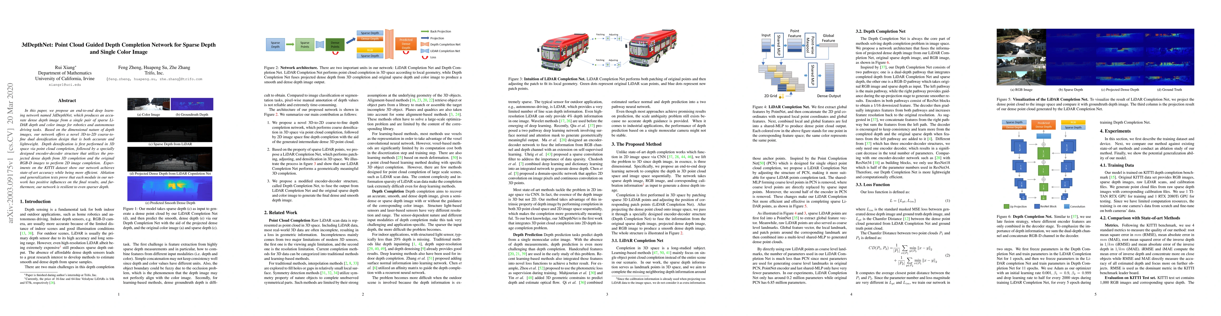 3dDepthNet is an end-to-end deep learning network that generates accurate dense depth images from sparse LiDAR depth and color images, employing a 3D-to-2D coarse-to-fine design for efficient depth completion. The network achieves state-of-the-art accuracy on the KITTI dataset while maintaining efficiency.