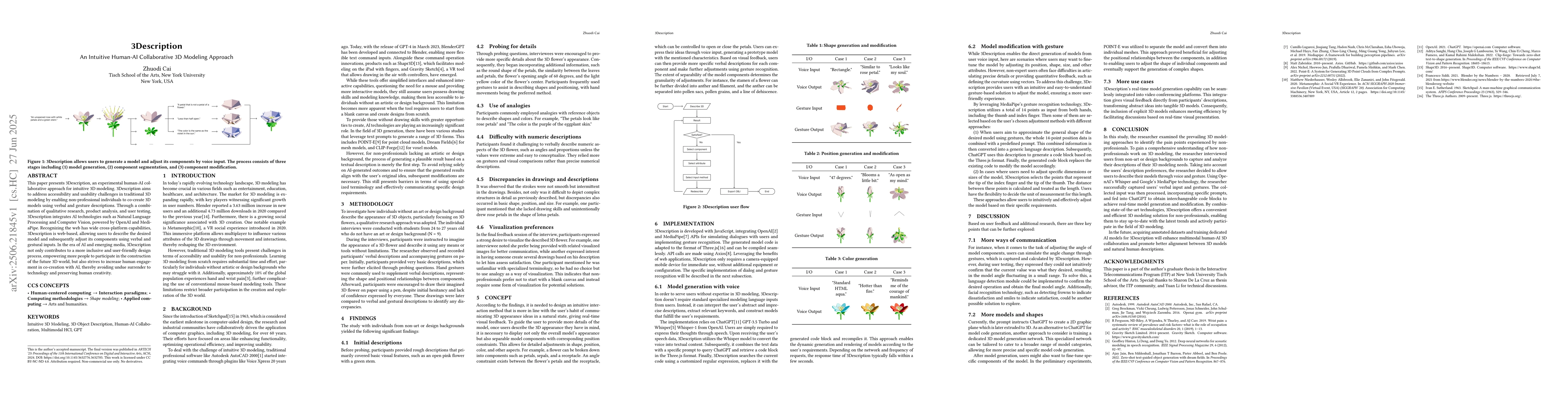This paper presents 3Description, an experimental human-AI collaborative approach for intuitive 3D modeling. 3Description aims to address accessibility and usability challenges in traditional 3D modeling by enabling non-professional individuals to co-create 3D models using verbal and gesture descriptions. Through a combination of qualitative research, product analysis, and user testing, 3Description integrates AI technologies such as Natural Language Processing and Computer Vision, powered by OpenAI and MediaPipe. Recognizing the web has wide cross-platform capabilities, 3Description is web-based, allowing users to describe the desired model and subsequently adjust its components using verbal and gestural inputs. In the era of AI and emerging media, 3Description not only contributes to a more inclusive and user-friendly design process, empowering more people to participate in the construction of the future 3D world, but also strives to increase human engagement in co-creation with AI, thereby avoiding undue surrender to technology and preserving human creativity.