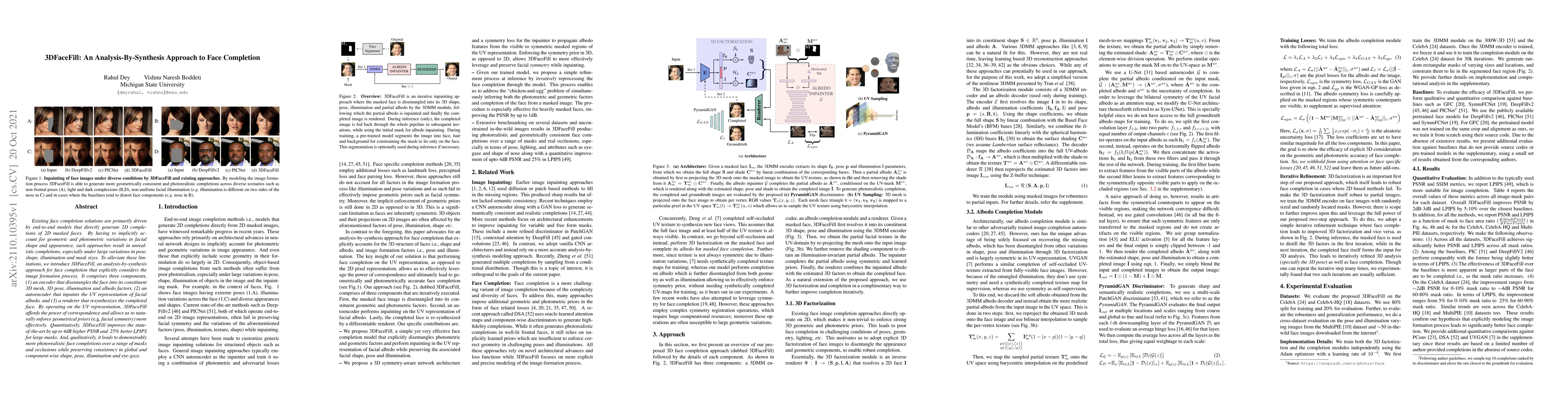 Existing face completion solutions are primarily driven by end-to-end models that directly generate 2D completions of 2D masked faces. By having to implicitly account for geometric and photometric variations in facial shape and appearance, such approaches result in unrealistic completions, especially under large variations in pose, shape, illumination and mask sizes. To alleviate these limitations, we introduce 3DFaceFill, an analysis-by-synthesis approach for face completion that explicitly considers the image formation process. It comprises three components, (1) an encoder that disentangles the face into its constituent 3D mesh, 3D pose, illumination and albedo factors, (2) an autoencoder that inpaints the UV representation of facial albedo, and (3) a renderer that resynthesizes the completed face. By operating on the UV representation, 3DFaceFill affords the power of correspondence and allows us to naturally enforce geometrical priors (e.g. facial symmetry) more effectively. Quantitatively, 3DFaceFill improves the state-of-the-art by up to 4dB higher PSNR and 25% better LPIPS for large masks. And, qualitatively, it leads to demonstrably more photorealistic face completions over a range of masks and occlusions while preserving consistency in global and component-wise shape, pose, illumination and eye-gaze.