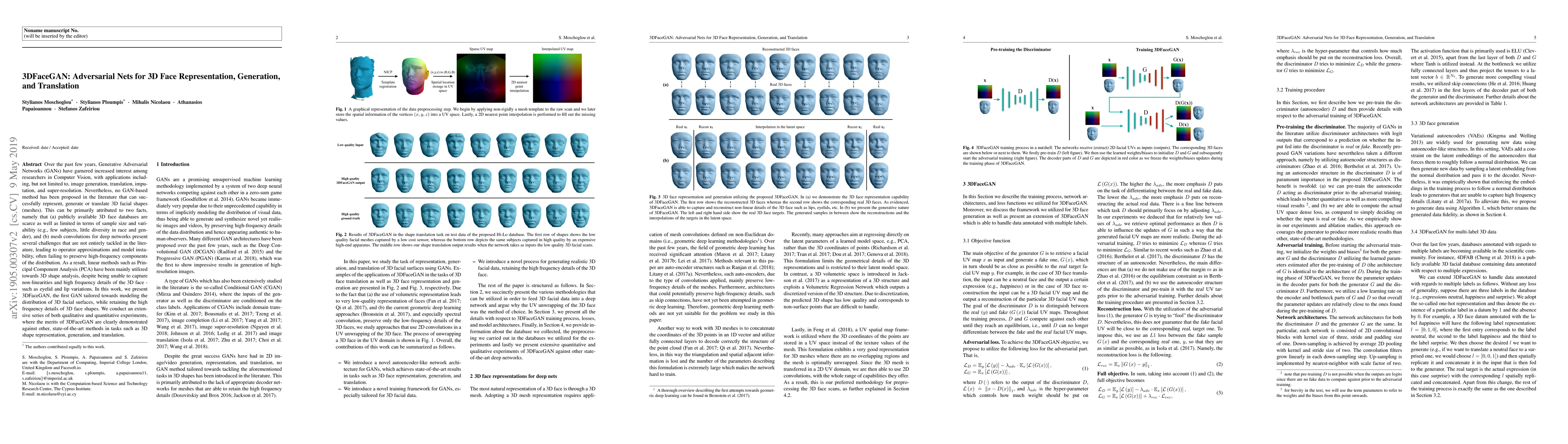 3DFaceGAN introduces the first Generative Adversarial Network (GAN) designed to model 3D facial shapes, addressing challenges in representation, generation, and translation of 3D faces. The method successfully captures high-frequency details, outperforming existing linear methods and state-of-the-art techniques in 3D shape analysis.