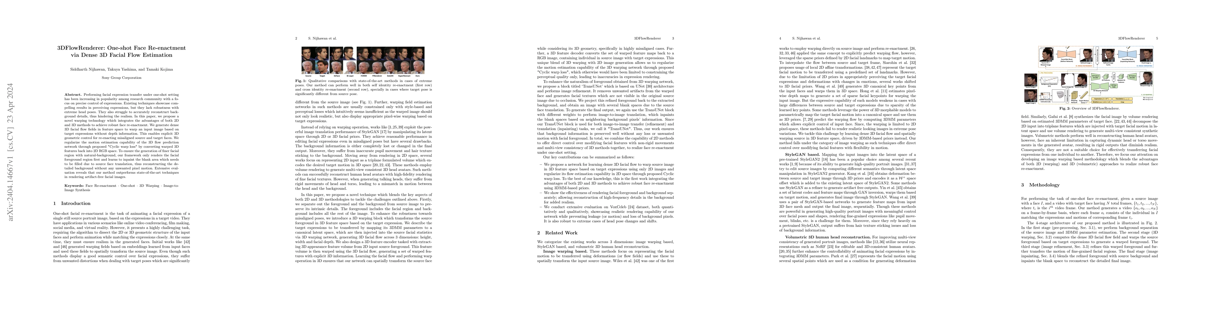 The paper proposes a novel warping technology called 3DFlowRenderer for one-shot face re-enactment by generating dense 3D facial flow fields, achieving robust control over facial expressions even under extreme head poses. The method integrates 2D and 3D techniques, optimizes 3D flow estimation with a Cyclic warp loss, and reconstructs backgrounds naturally by inpainting the translated facial region.