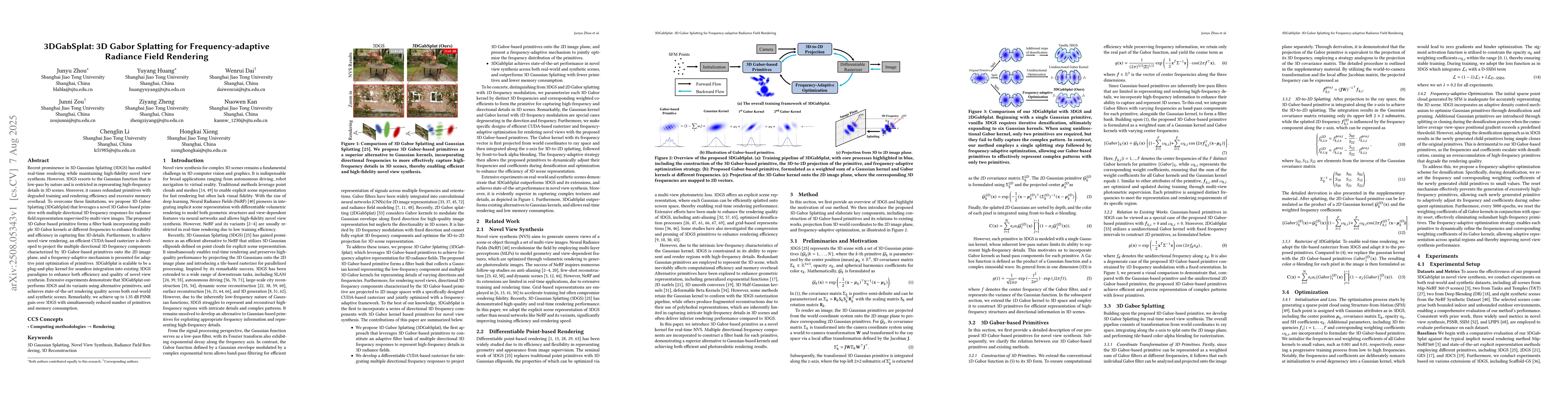 Recent prominence in 3D Gaussian Splatting (3DGS) has enabled real-time rendering while maintaining high-fidelity novel view synthesis. However, 3DGS resorts to the Gaussian function that is low-pass by nature and is restricted in representing high-frequency details in 3D scenes. Moreover, it causes redundant primitives with degraded training and rendering efficiency and excessive memory overhead. To overcome these limitations, we propose 3D Gabor Splatting (3DGabSplat) that leverages a novel 3D Gabor-based primitive with multiple directional 3D frequency responses for radiance field representation supervised by multi-view images. The proposed 3D Gabor-based primitive forms a filter bank incorporating multiple 3D Gabor kernels at different frequencies to enhance flexibility and efficiency in capturing fine 3D details. Furthermore, to achieve novel view rendering, an efficient CUDA-based rasterizer is developed to project the multiple directional 3D frequency components characterized by 3D Gabor-based primitives onto the 2D image plane, and a frequency-adaptive mechanism is presented for adaptive joint optimization of primitives. 3DGabSplat is scalable to be a plug-and-play kernel for seamless integration into existing 3DGS paradigms to enhance both efficiency and quality of novel view synthesis. Extensive experiments demonstrate that 3DGabSplat outperforms 3DGS and its variants using alternative primitives, and achieves state-of-the-art rendering quality across both real-world and synthetic scenes. Remarkably, we achieve up to 1.35 dB PSNR gain over 3DGS with simultaneously reduced number of primitives and memory consumption.