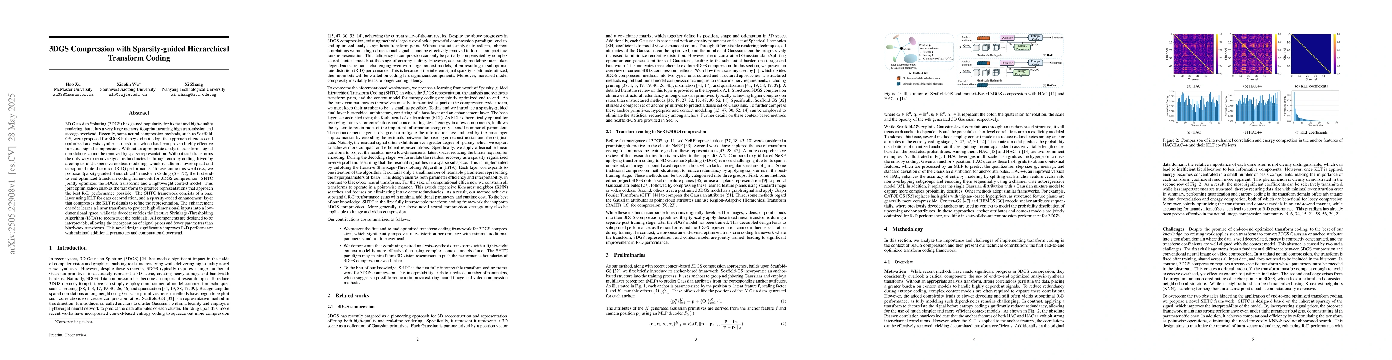 The research proposes Sparsity-guided Hierarchical Transform Coding (SHTC), an end-to-end optimized transform coding framework for 3DGS compression. SHTC jointly optimizes 3D Gaussian Splatting, transforms, and a lightweight context model, utilizing KLT for data decorrelation in the base layer and a sparsity-coded enhancement layer for refining the representation.