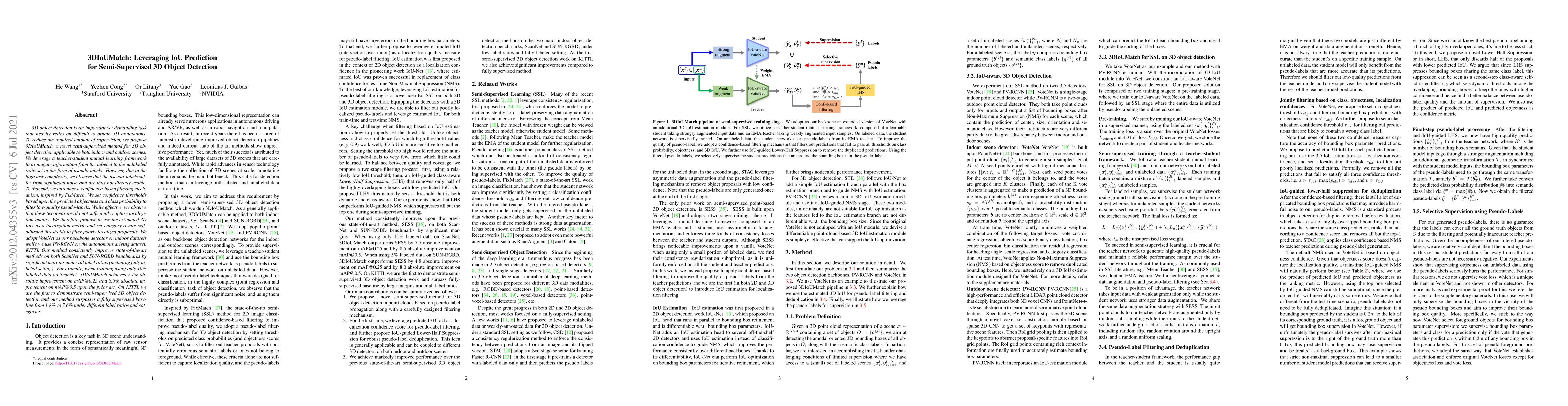 3D object detection is an important yet demanding task that heavily relies on difficult to obtain 3D annotations. To reduce the required amount of supervision, we propose 3DIoUMatch, a novel semi-supervised method for 3D object detection applicable to both indoor and outdoor scenes. We leverage a teacher-student mutual learning framework to propagate information from the labeled to the unlabeled train set in the form of pseudo-labels. However, due to the high task complexity, we observe that the pseudo-labels suffer from significant noise and are thus not directly usable. To that end, we introduce a confidence-based filtering mechanism, inspired by FixMatch. We set confidence thresholds based upon the predicted objectness and class probability to filter low-quality pseudo-labels. While effective, we observe that these two measures do not sufficiently capture localization quality. We therefore propose to use the estimated 3D IoU as a localization metric and set category-aware self-adjusted thresholds to filter poorly localized proposals. We adopt VoteNet as our backbone detector on indoor datasets while we use PV-RCNN on the autonomous driving dataset, KITTI. Our method consistently improves state-of-the-art methods on both ScanNet and SUN-RGBD benchmarks by significant margins under all label ratios (including fully labeled setting). For example, when training using only 10\% labeled data on ScanNet, 3DIoUMatch achieves 7.7% absolute improvement on [email protected] and 8.5% absolute improvement on [email protected] upon the prior art. On KITTI, we are the first to demonstrate semi-supervised 3D object detection and our method surpasses a fully supervised baseline from 1.8% to 7.6% under different label ratios and categories.