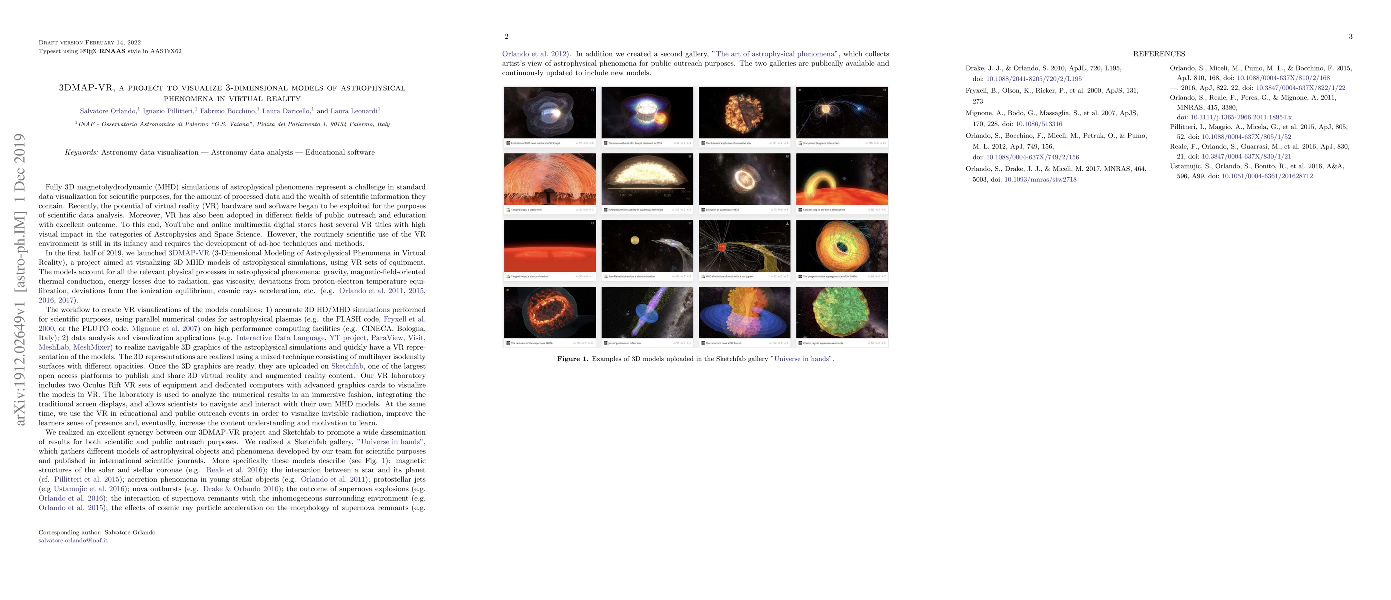This paper introduces 3DMAP-VR, a project that visualizes 3D magnetohydrodynamic models of astrophysical phenomena in virtual reality, incorporating various physical processes. The project leverages Sketchfab for broad dissemination and outreach, enhancing both scientific and public engagement.