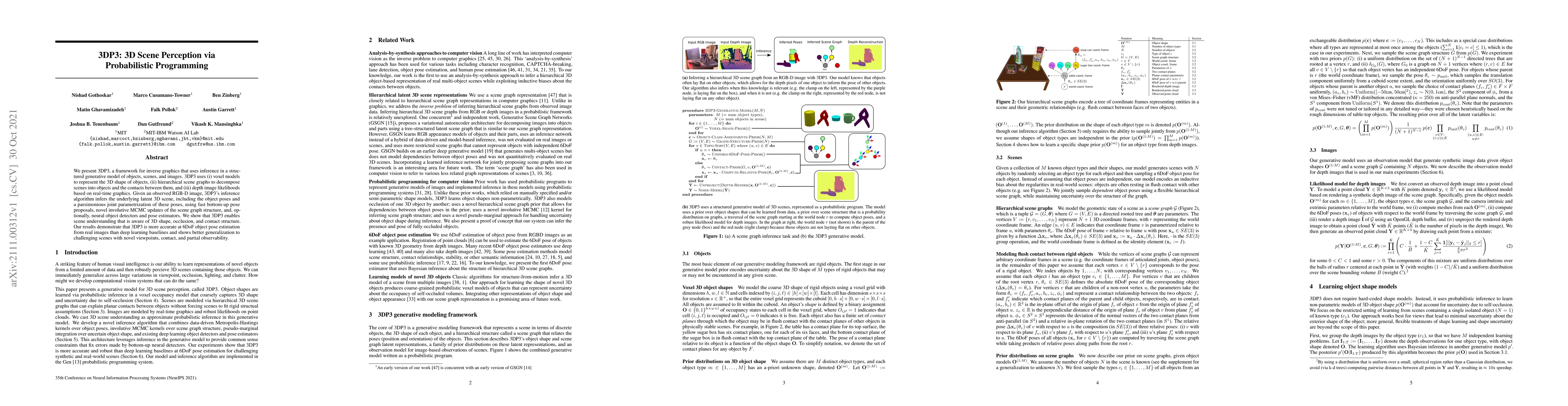 We present 3DP3, a framework for inverse graphics that uses inference in a structured generative model of objects, scenes, and images. 3DP3 uses (i) voxel models to represent the 3D shape of objects, (ii) hierarchical scene graphs to decompose scenes into objects and the contacts between them, and (iii) depth image likelihoods based on real-time graphics. Given an observed RGB-D image, 3DP3's inference algorithm infers the underlying latent 3D scene, including the object poses and a parsimonious joint parametrization of these poses, using fast bottom-up pose proposals, novel involutive MCMC updates of the scene graph structure, and, optionally, neural object detectors and pose estimators. We show that 3DP3 enables scene understanding that is aware of 3D shape, occlusion, and contact structure. Our results demonstrate that 3DP3 is more accurate at 6DoF object pose estimation from real images than deep learning baselines and shows better generalization to challenging scenes with novel viewpoints, contact, and partial observability.
