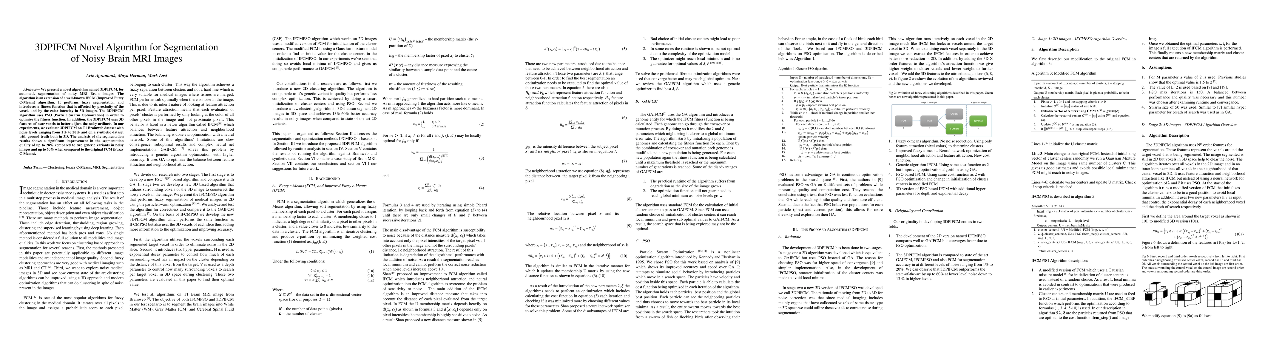 The 3DPIFCM algorithm extends the Improved Fuzzy C-Means for automatic segmentation of noisy MRI brain images, optimizing a fitness function using Particle Swarm Optimization and incorporating 3D voxel features to mitigate noise. Experimental results show significant improvements in segmentation quality, up to 28% better than generic variants and 60% better than the original FCM.