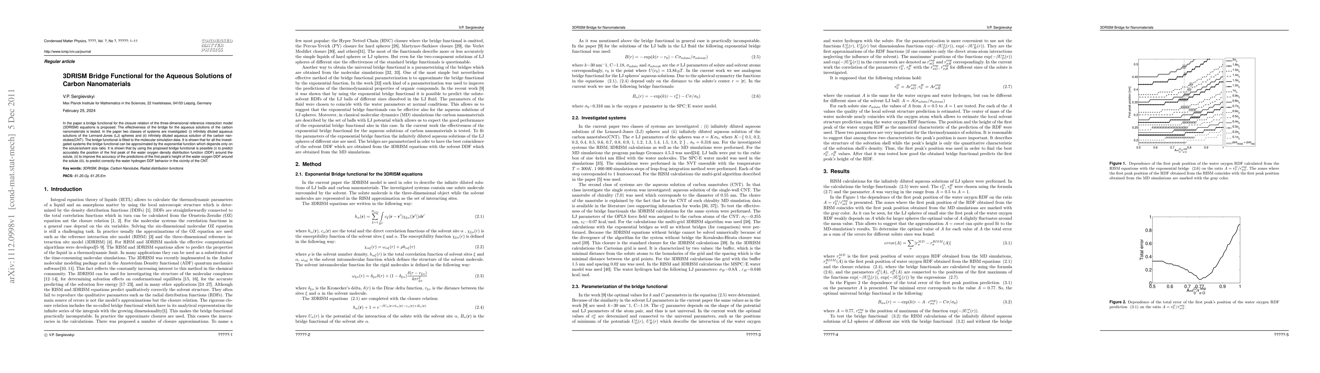 The paper proposes a bridge functional for the 3DRISM equations to model aqueous solutions of carbon nanomaterials, showing it can be approximated by an exponential function based on solute/solvent size ratio. The functional accurately predicts the first peak position and height of the water oxygen density distribution function around solutes and correctly models water hydrogen distribution near carbon nanotubes.