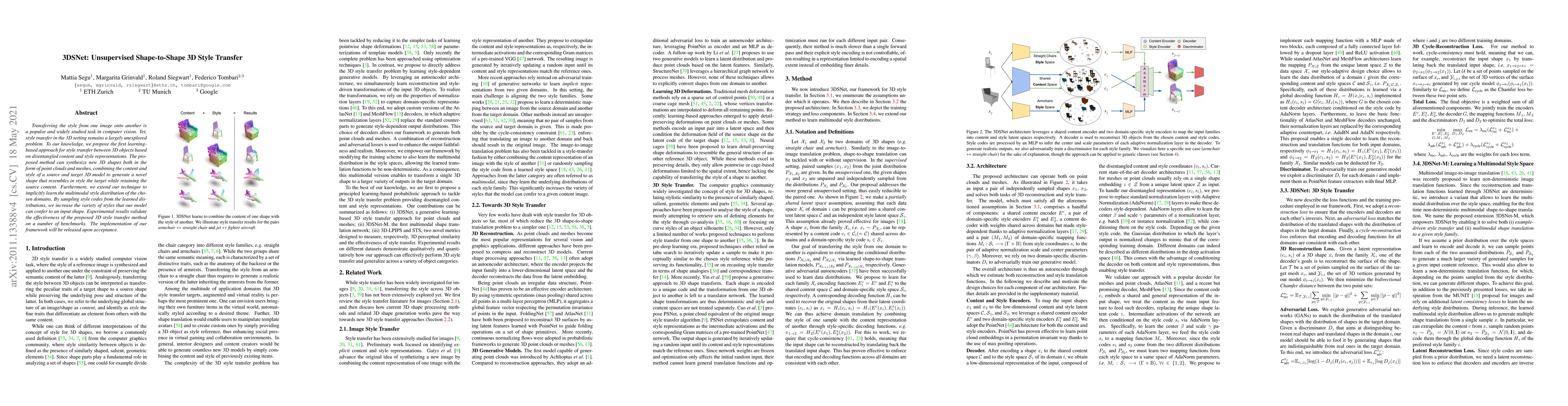 The paper proposes 3DSNet, a learning-based approach for unsupervised style transfer between 3D objects using disentangled content and style representations. It combines content and style of source and target 3D models to generate novel shapes resembling the target's style while retaining the source's content. The method extends to learn multimodal style distributions, increasing style variety.