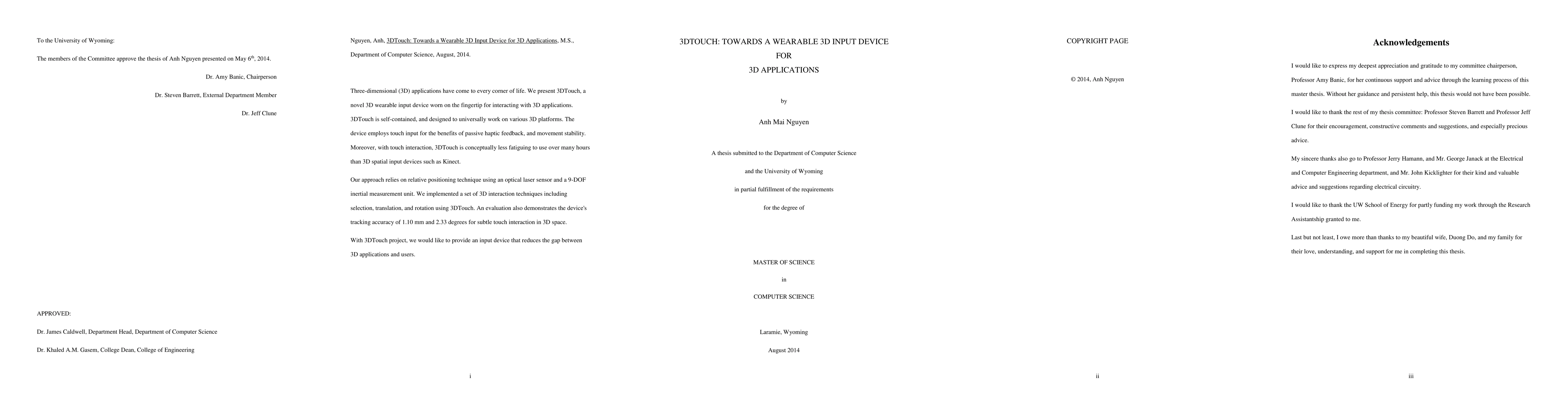The paper introduces 3DTouch, a wearable 3D input device for fingertip interaction with 3D applications, featuring passive haptic feedback and movement stability. The device employs an optical laser sensor and a 9-DOF inertial measurement unit for precise tracking, demonstrating a tracking accuracy of 1.10 mm and 2.33 degrees.
