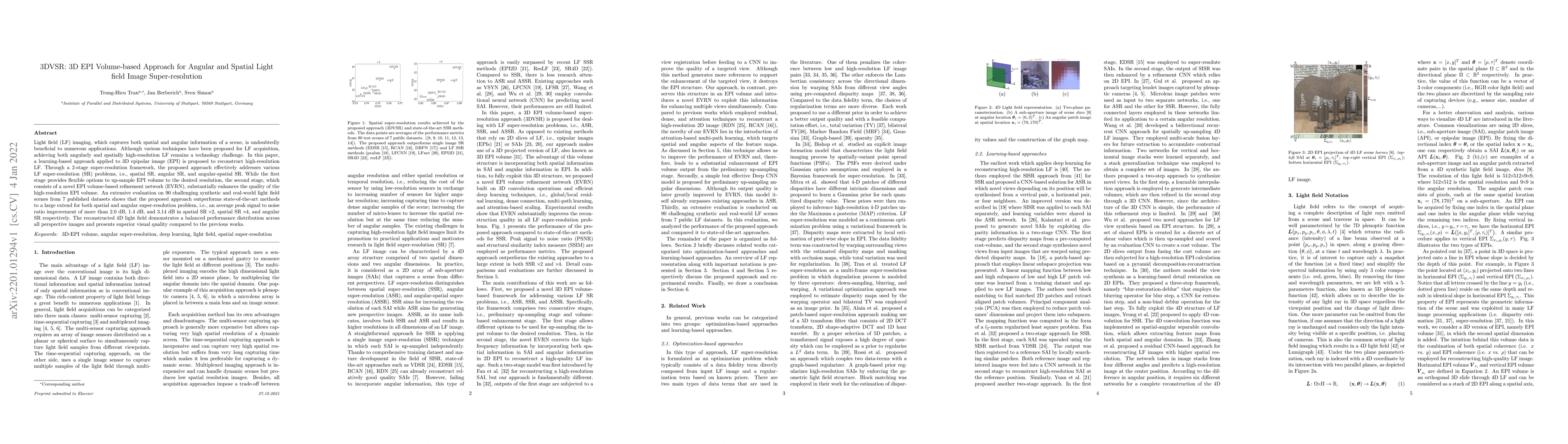 The paper proposes a 3D EPI Volume-based Approach for Angular and Spatial Light field Image Super-resolution (3DVSR), which uses a learning-based method to reconstruct high-resolution light fields through a 2-stage super-resolution framework. The approach significantly outperforms state-of-the-art methods, achieving notable improvements in both spatial and angular resolution.