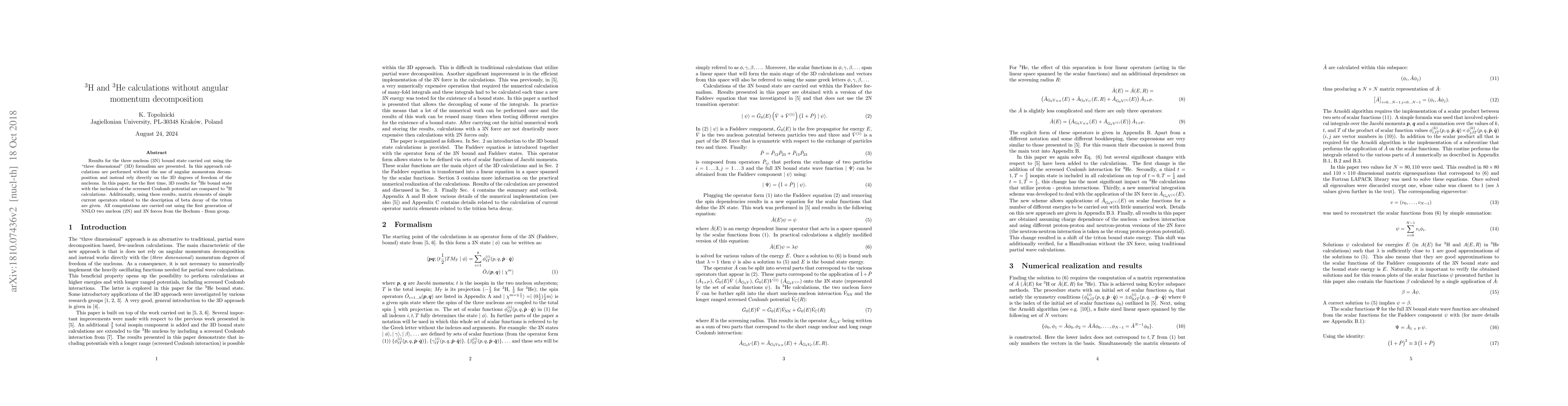 This paper presents 3D calculations for 3H and 3He bound states without angular momentum decomposition, using the first generation of NNLO 2N and 3N forces. For the first time, 3D results for 3He, including the screened Coulomb potential, are compared to 3H calculations and matrix elements for beta decay related current operators are provided.