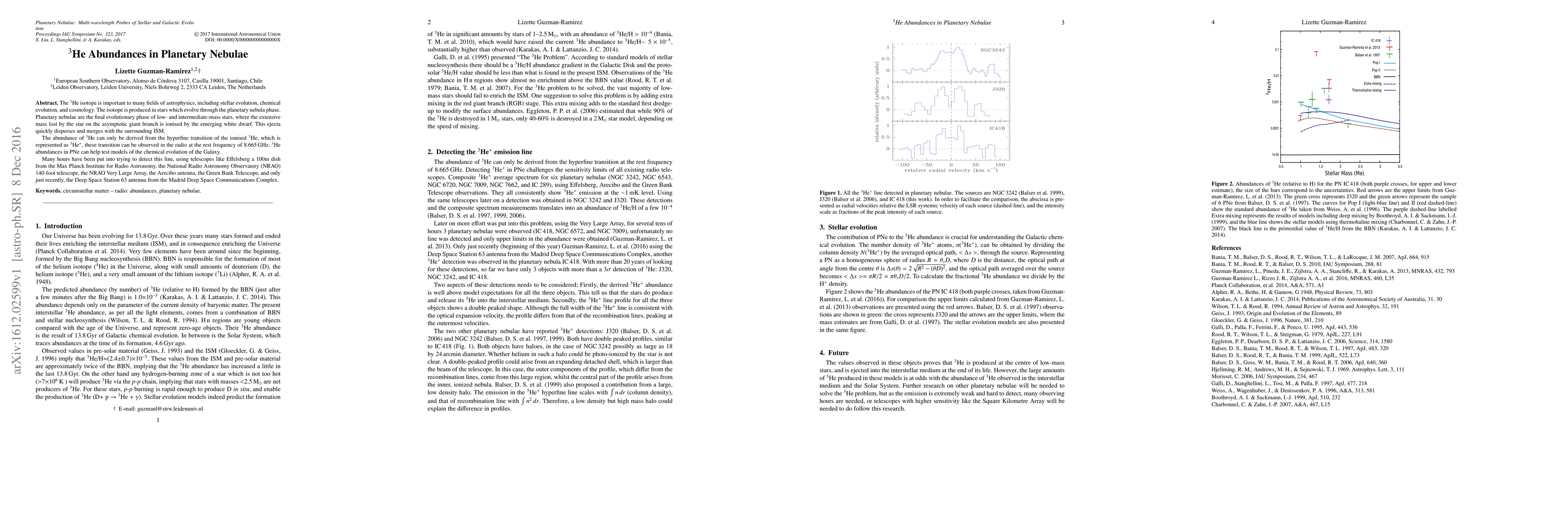 The $^3$He isotope is important to many fields of astrophysics, including stellar evolution, chemical evolution, and cosmology. The isotope is produced in stars which evolve through the planetary nebula phase. Planetary nebulae are the final evolutionary phase of low- and intermediate-mass stars, where the extensive mass lost by the star on the asymptotic giant branch is ionised by the emerging white dwarf. This ejecta quickly disperses and merges with the surrounding ISM. The abundance of $^3$He can only be derived from the hyperfine transition of the ionised $^3$He, which is represented as $^3$He$^+$, these transition can be observed in the radio at the rest frequency of 8.665 GHz. $^3$He abundances in PNe can help test models of the chemical evolution of the Galaxy. Many hours have been put into trying to detect this line, using telescopes like Effelsberg a 100m dish from the Max Planck Institute for Radio Astronomy, the National Radio Astronomy Observatory (NRAO) 140-foot telescope, the NRAO Very Large Array, the Arecibo antenna, the Green Bank Telescope, and only just recently, the Deep Space Station 63 antenna from the Madrid Deep Space Communications Complex.