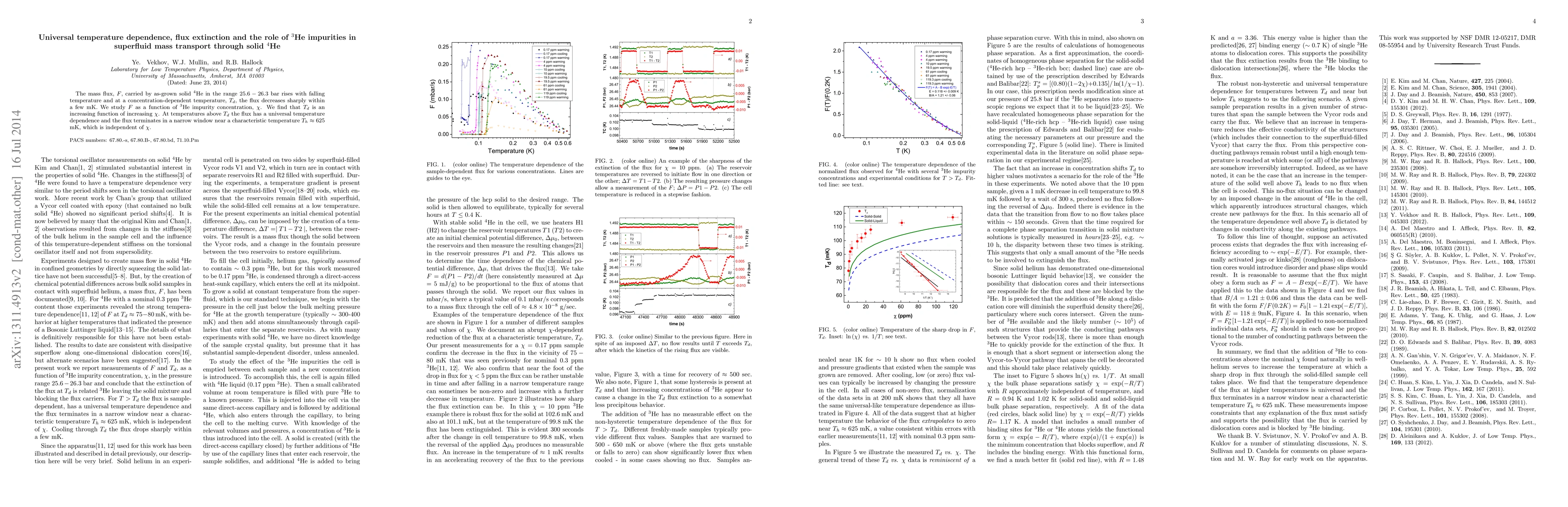 The flux, $F$, carried by solid $^4$He in the range $25.6 - 26.3$ bar rises with falling temperature and at a temperature $T_d$ the flux decreases toward zero. We study $F$ as a function of $^3$He impurity concentration, $\chi$. At temperatures above $T_d$ the flux has an unexpected universal temperature dependence and the flux terminates in a narrow window near a characteristic temperature $T_h \approx$ 610 mK, which is independent of $\chi$. We find that $T_d$ is an increasing function of increasing $\chi$. We document that the extinction of the flux at $T_d$ is prompt and precipitous, with the transition complete within a few mK. Comparison of our ($T_d, \chi$) results with a calculated phase separation line suggests that the extinction of the flux is related to phase separation.