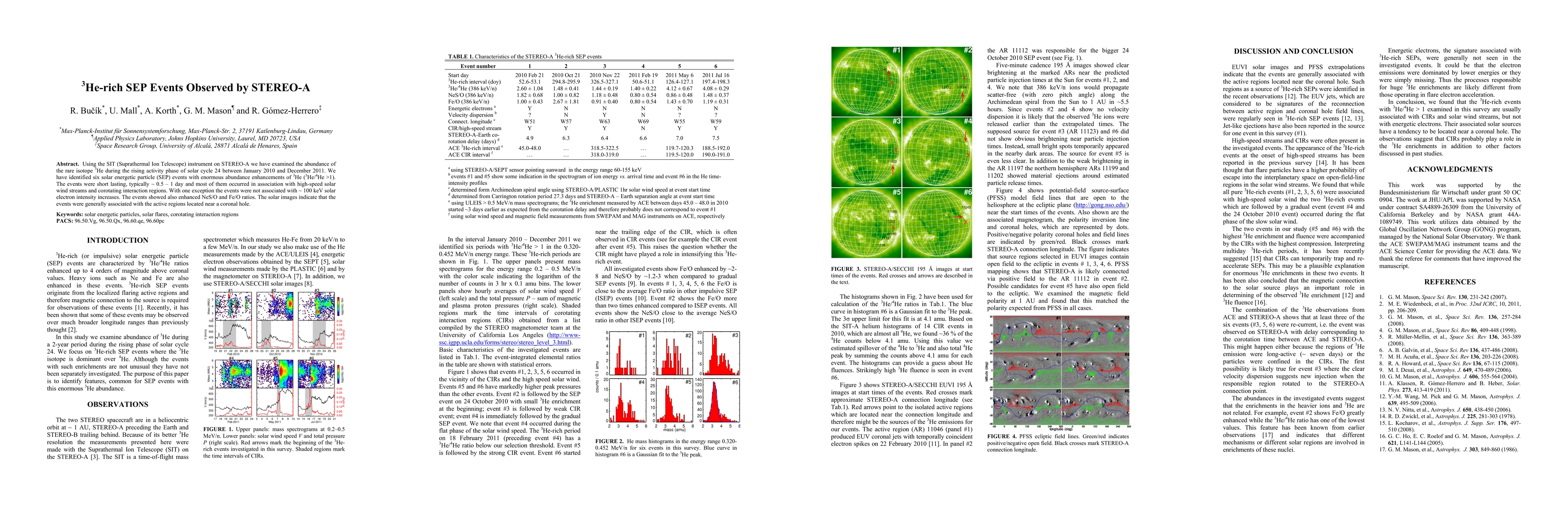 Using the SIT (Suprathermal Ion Telescope) instrument on STEREO-A we have examined the abundance of the rare isotope 3He during the rising activity phase of solar cycle 24 between January 2010 and December 2011. We have identified six solar energetic particle (SEP) events with enormous abundance enhancements of 3He (3He/4He >1). The events were short lasting, typically ~0.5-1 day and most of them occurred in association with high-speed solar wind streams and corotating interaction regions. With one exception the events were not associated with ~100 keV solar electron intensity increases. The events showed also enhanced NeS/O and Fe/O ratios. The solar images indicate that the events were generally associated with the active regions located near a coronal hole.