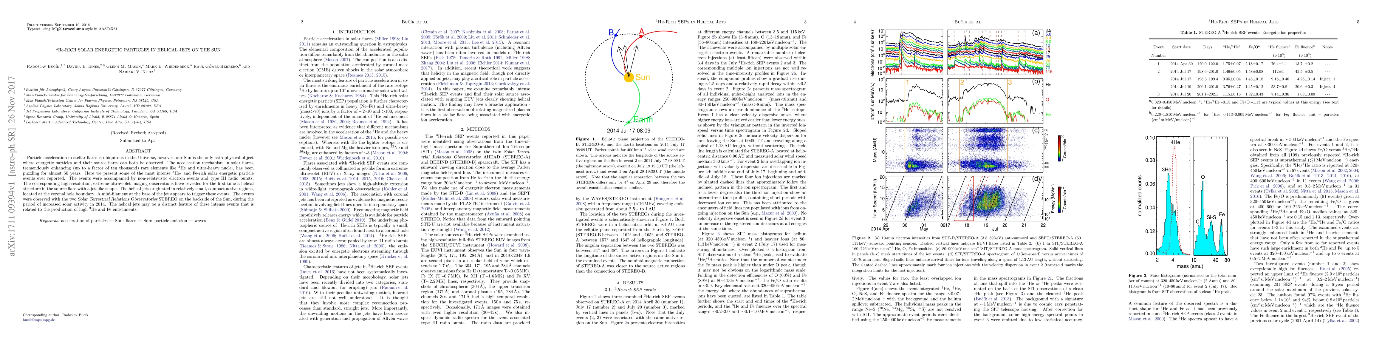 Particle acceleration in stellar flares is ubiquitous in the Universe, however, our Sun is the only astrophysical object where energetic particles and their source flares can both be observed. The acceleration mechanism in solar flares, tremendously enhancing (up to a factor of ten thousand) rare elements like 3He and ultra-heavy nuclei, has been puzzling for almost 50 years. Here we present some of the most intense 3He- and Fe-rich solar energetic particle events ever reported. The events were accompanied by non-relativistic electron events and type III radio bursts. The corresponding high-resolution, extreme-ultraviolet imaging observations have revealed for the first time a helical structure in the source flare with a jet-like shape. The helical jets originated in relatively small, compact active regions, located at the coronal hole boundary. A mini-filament at the base of the jet appears to trigger these events. The events were observed with the two Solar Terrestrial Relations Observatories STEREO on the backside of the Sun, during the period of increased solar activity in 2014. The helical jets may be a distinct feature of these intense events that is related to the production of high 3He and Fe enrichments.