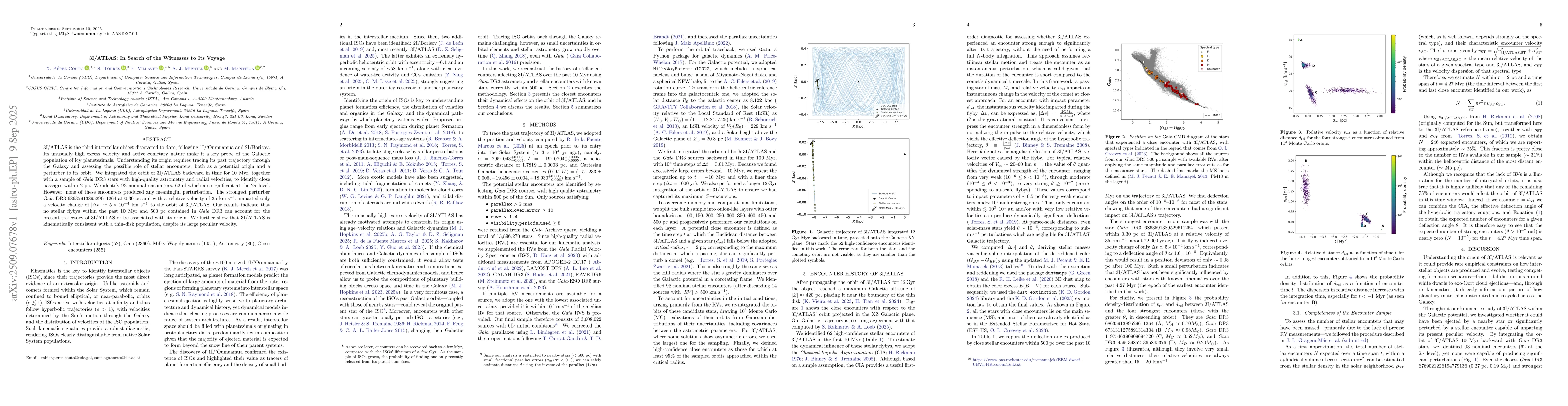 3I/ATLAS is the third interstellar object discovered to date, following 1I/'Oumuamua and 2I/Borisov. Its unusually high excess velocity and active cometary nature make it a key probe of the Galactic population of icy planetesimals. Understanding its origin requires tracing its past trajectory through the Galaxy and assessing the possible role of stellar encounters, both as a potential origin and a perturber to its orbit. We integrated the orbit of 3I/ATLAS backward in time for 10 Myr, together with a sample of Gaia DR3 stars with high-quality astrometry and radial velocities, to identify close passages within 2 pc. We identify 93 nominal encounters, 62 of which are significant at the $2\sigma$ level. However, none of these encounters produced any meaningful perturbation. The strongest perturber Gaia DR3 6863591389529611264 at 0.30 pc and with a relative velocity of 35 km s$^{-1}$, imparted only a velocity change of $|\Delta v| \simeq 5\times10^{-4}$ km s$^{-1}$ to the orbit of 3I/ATLAS. Our results indicate that no stellar flybys within the past 10 Myr and 500 pc contained in Gaia DR3 can account for the present trajectory of 3I/ATLAS or be associated with its origin. We further show that 3I/ATLAS is kinematically consistent with a thin-disk population, despite its large peculiar velocity.