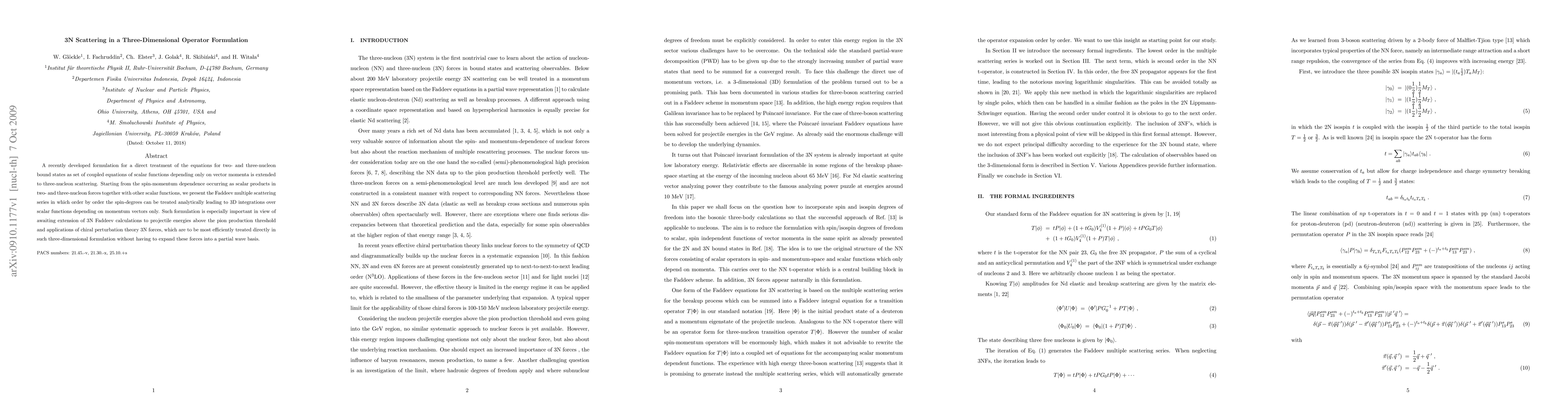 This paper extends a three-dimensional operator formulation to three-nucleon scattering, presenting the Faddeev series with analytical treatment of spin-degrees through 3D integrations over scalar functions dependent on momentum vectors. This approach is crucial for future high-energy 3N calculations and applications of chiral perturbation theory 3N forces.