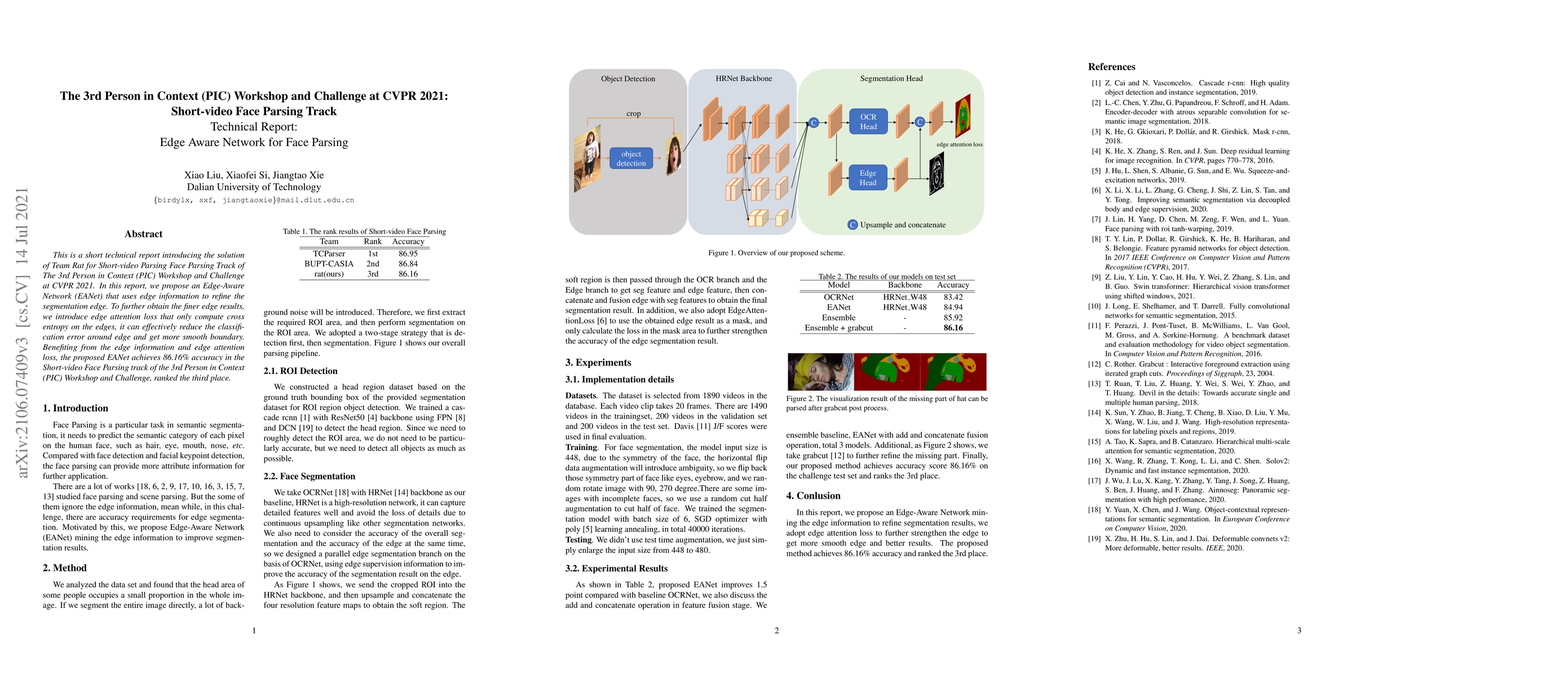This paper presents Team Rat's third-place solution for the Short-video Face Parsing Track at the CVPR 2021 PIC Workshop, utilizing an Edge-Aware Network (EANet) that refines segmentation edges using edge information and an edge attention loss for smoother boundaries, achieving 86.16% accuracy.