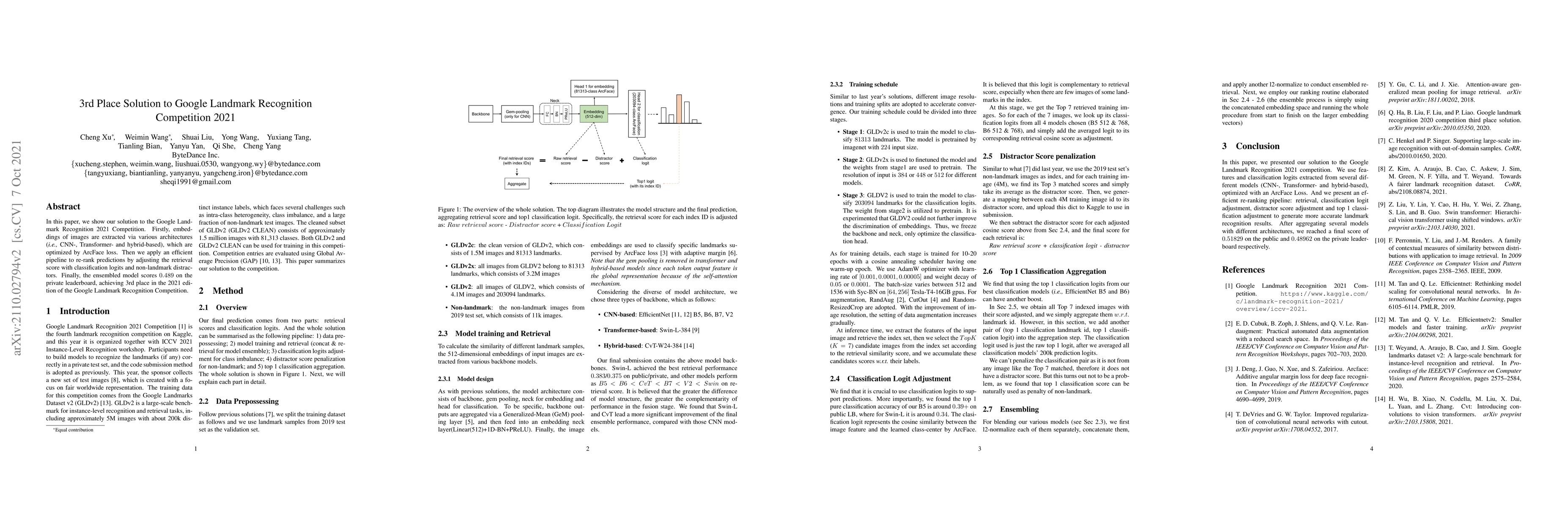In this paper, we show our solution to the Google Landmark Recognition 2021 Competition. Firstly, embeddings of images are extracted via various architectures (i.e. CNN-, Transformer- and hybrid-based), which are optimized by ArcFace loss. Then we apply an efficient pipeline to re-rank predictions by adjusting the retrieval score with classification logits and non-landmark distractors. Finally, the ensembled model scores 0.489 on the private leaderboard, achieving the 3rd place in the 2021 edition of the Google Landmark Recognition Competition.