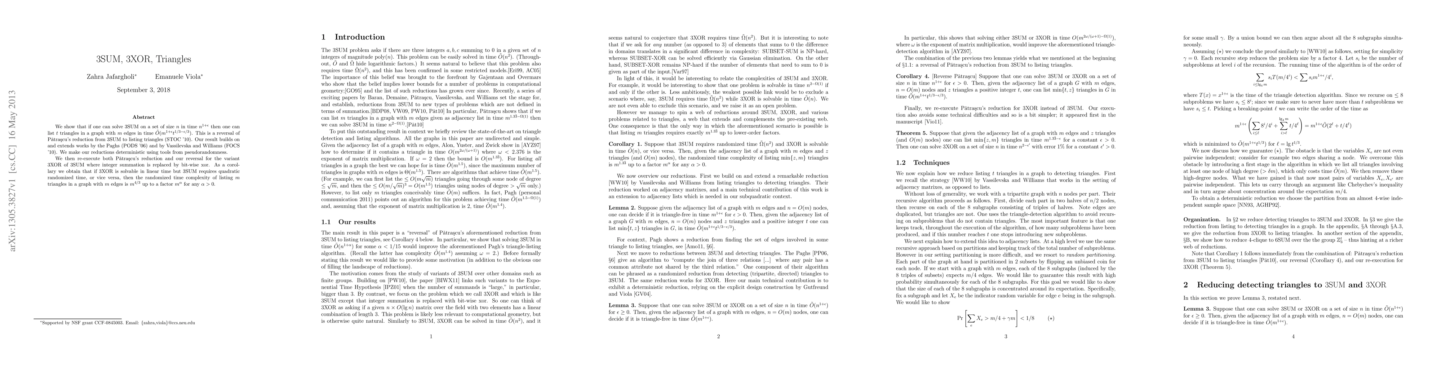 We show that if one can solve 3SUM on a set of size n in time n^{1+\e} then one can list t triangles in a graph with m edges in time O(m^{1+\e}t^{1/3-\e/3}). This is a reversal of Patrascu's reduction from 3SUM to listing triangles (STOC '10). Our result builds on and extends works by the Paghs (PODS '06) and by Vassilevska and Williams (FOCS '10). We make our reductions deterministic using tools from pseudorandomness. We then re-execute both Patrascu's reduction and our reversal for the variant 3XOR of 3SUM where integer summation is replaced by bit-wise xor. As a corollary we obtain that if 3XOR is solvable in linear time but 3SUM requires quadratic randomized time, or vice versa, then the randomized time complexity of listing m triangles in a graph with $m$ edges is m^{4/3} up to a factor m^\alpha for any \alpha > 0.