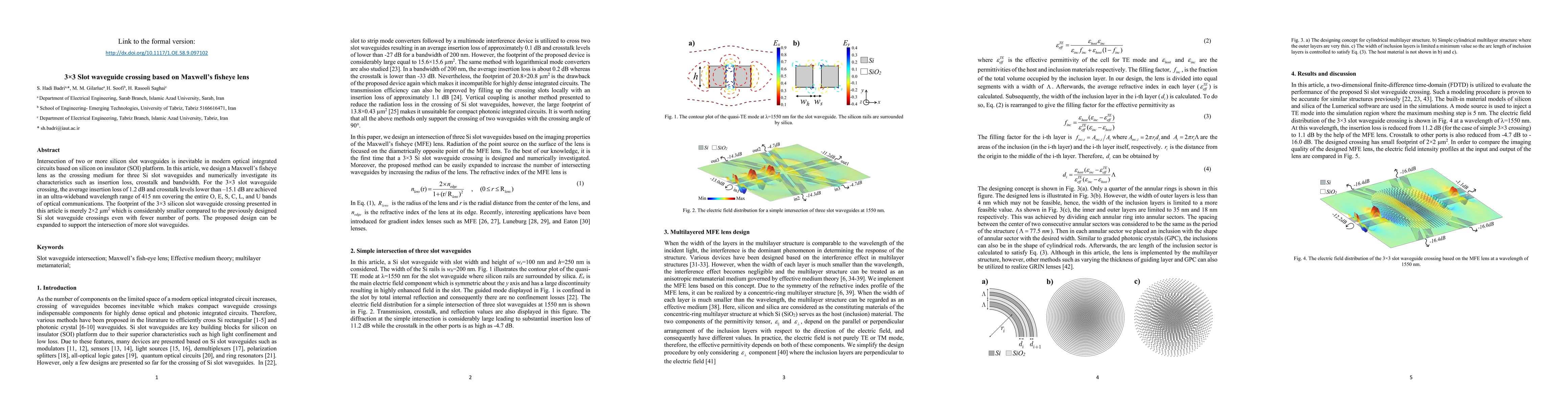 This paper presents a 3×3 silicon slot waveguide crossing based on a Maxwell's fisheye lens, achieving an average insertion loss of 1.2 dB and crosstalk below -15.1 dB across a wide optical bandwidth. The design occupies a compact footprint of 2×2 µm².