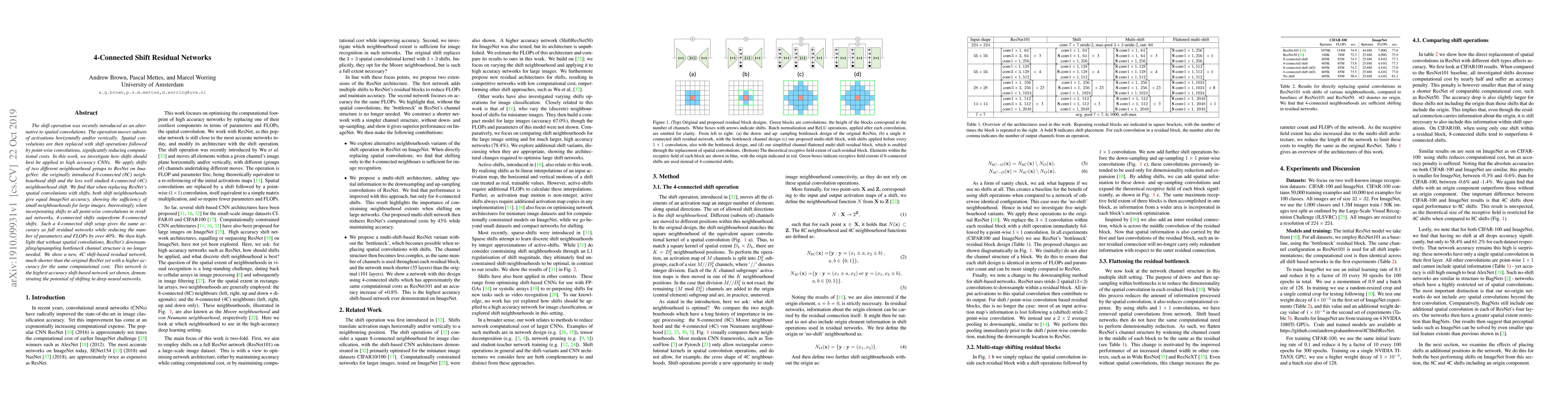 The shift operation was recently introduced as an alternative to spatial convolutions. The operation moves subsets of activations horizontally and/or vertically. Spatial convolutions are then replaced with shift operations followed by point-wise convolutions, significantly reducing computational costs. In this work, we investigate how shifts should best be applied to high accuracy CNNs. We apply shifts of two different neighbourhood groups to ResNet on ImageNet: the originally introduced 8-connected (8C) neighbourhood shift and the less well studied 4-connected (4C) neighbourhood shift. We find that when replacing ResNet's spatial convolutions with shifts, both shift neighbourhoods give equal ImageNet accuracy, showing the sufficiency of small neighbourhoods for large images. Interestingly, when incorporating shifts to all point-wise convolutions in residual networks, 4-connected shifts outperform 8-connected shifts. Such a 4-connected shift setup gives the same accuracy as full residual networks while reducing the number of parameters and FLOPs by over 40%. We then highlight that without spatial convolutions, ResNet's downsampling/upsampling bottleneck channel structure is no longer needed. We show a new, 4C shift-based residual network, much shorter than the original ResNet yet with a higher accuracy for the same computational cost. This network is the highest accuracy shift-based network yet shown, demonstrating the potential of shifting in deep neural networks.