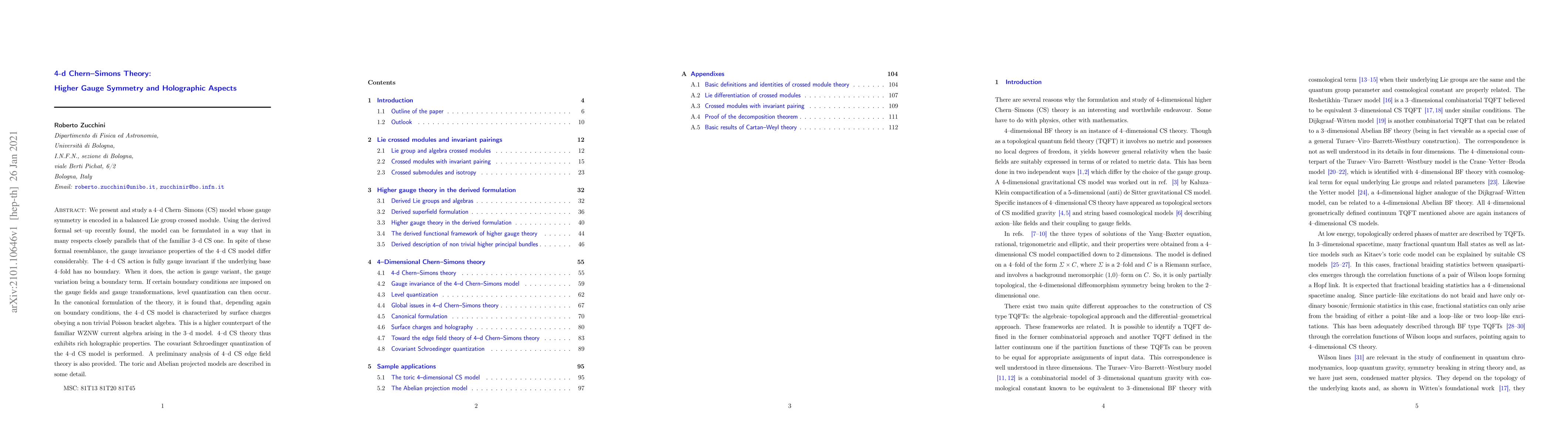 We present and study a 4d Chern-Simons (CS) model whose gauge symmetry is encoded in a balanced Lie group crossed module. Using the derived formal set-up recently found, the model can be formulated in a way that in many respects closely parallels that of the familiar 3d CS one. In spite of these formal resemblance, the gauge invariance properties of the 4d CS model differ considerably. The 4d CS action is fully gauge invariant if the underlying base 4fold has no boundary. When it does, the action is gauge variant, the gauge variation being a boundary term. If certain boundary conditions are imposed on the gauge fields and gauge transformations, level quantization can then occur. In the canonical formulation of the theory, it is found that, depending again on boundary conditions, the 4d CS model is characterized by surface charges obeying a non trivial Poisson bracket algebra. This is a higher counterpart of the familiar WZNW current algebra arising in the 3d model. 4d CS theory thus exhibits rich holographic properties. The covariant Schroedinger quantization of the 4d CS model is performed. A preliminary analysis of 4d CS edge field theory is also provided. The toric and Abelian projected models are described in some detail.