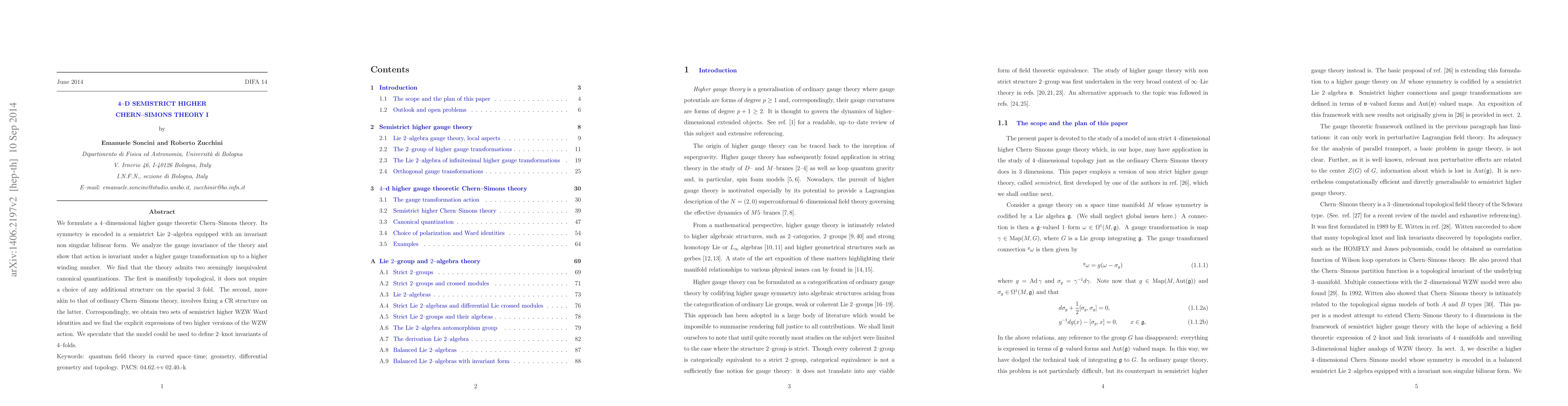 We formulate a 4-dimensional higher gauge theoretic Chern-Simons theory. Its symmetry is encoded in a semistrict Lie 2-algebra equipped with an invariant non singular bilinear form. We analyze the gauge invariance of the theory and show that action is invariant under a higher gauge transformation up to a higher winding number. We find that the theory admits two seemingly inequivalent canonical quantizations. The first is manifestly topological, it does not require a choice of any additional structure on the spacial 3-fold. The second, more akin to that of ordinary Chern-Simons theory, involves fixing a CR structure on the latter. Correspondingly, we obtain two sets of semistrict higher WZW Ward identities and we find the explicit expressions of two higher versions of the WZW action. We speculate that the model could be used to define 2-knot invariants of 4-folds.