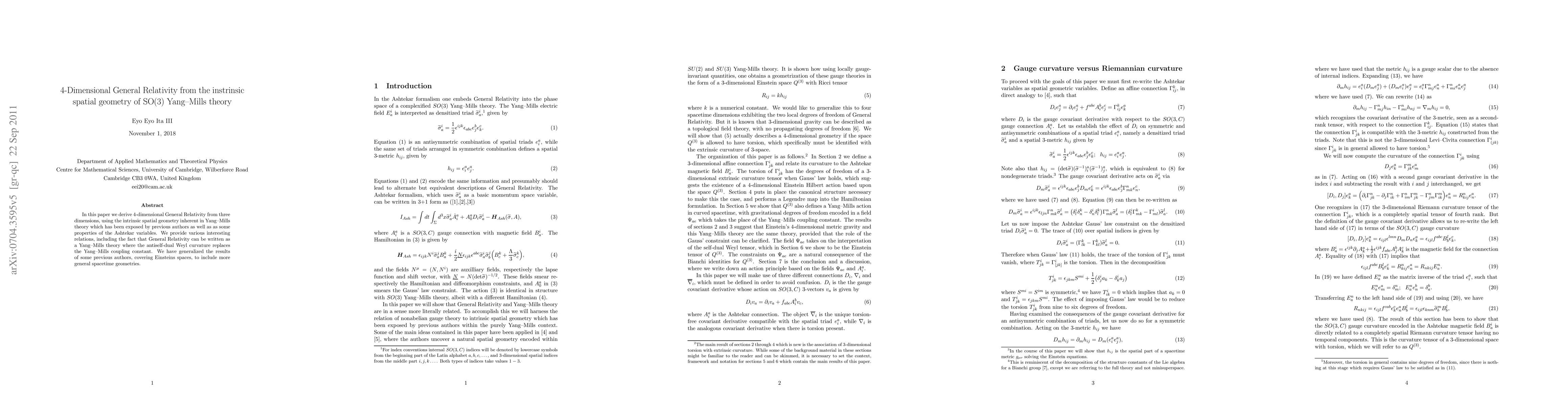 In this paper we derive 4-dimensional General Relativity from three dimensions, using the intrinsic spatial geometry inherent in Yang--Mills theory which has been exposed by previous authors as well as as some properties of the Ashtekar variables. We provide various interesting relations, including the fact that General Relativity can be written as a Yang--Mills theory where the antiself-dual Weyl curvature replaces the Yang--Mills coupling constant. We have generalized the results of some previous authors, covering Einsteins spaces, to include more general spacetime geometries.