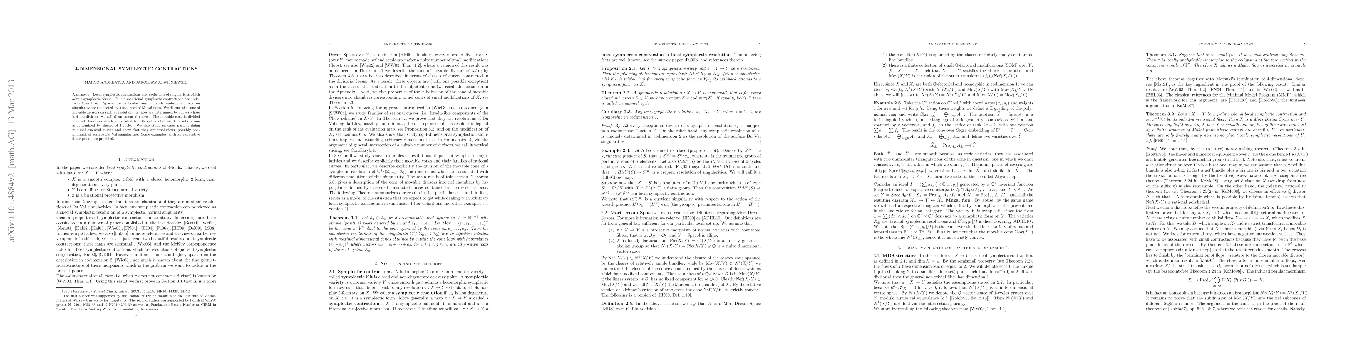 Local symplectic contractions are resolutions of singularities which admit symplectic forms. Four dimensional symplectic contractions are (relative) Mori Dream Spaces. In particular, any two such resolutions of a given singularity are connected by a sequence of Mukai flops. We discuss the cone of movable divisors on such a resolution; its faces are determined by curves whose loci are divisors, we call them essential curves. The movable cone is divided into nef chambers which are related to different resolutions; this subdivision is determined by classes of 1-cycles. We also study schemes parametrizing minimal essential curves and show that they are resolutions, possibly non-minimal, of surface Du Val singularities. Some examples, with an exhaustive description, are provided.