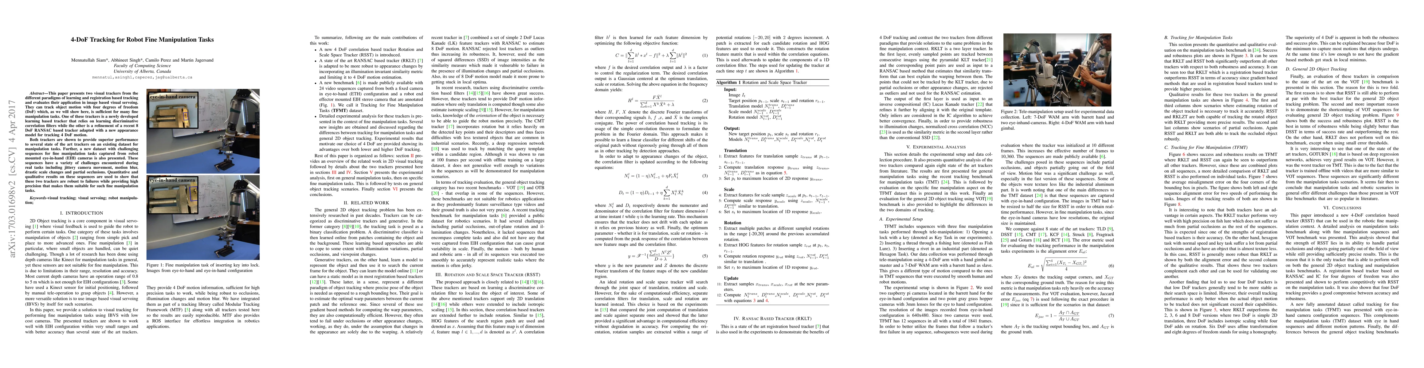 This paper introduces two visual trackers for robot fine manipulation tasks, one learning-based and the other a refined RANSAC tracker, both tracking 4 degrees of freedom (DoF). These trackers outperform state-of-the-art methods on a manipulation tasks dataset and a new challenging dataset with issues like camera jitter, motion blur, and occlusions, demonstrating robustness and high precision for real-world robot applications.