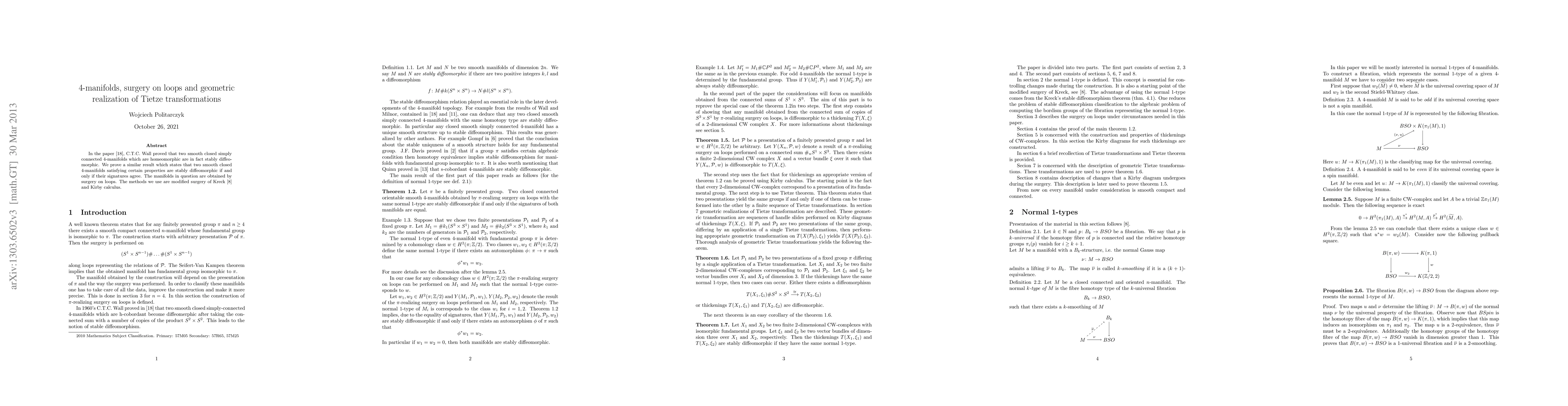 This paper proves that two smooth closed 4-manifolds obtained via surgery on loops are stably diffeomorphic if and only if their signatures match, using modified surgery techniques and Kirby calculus. This extends a result from Wall on simply connected 4-manifolds.