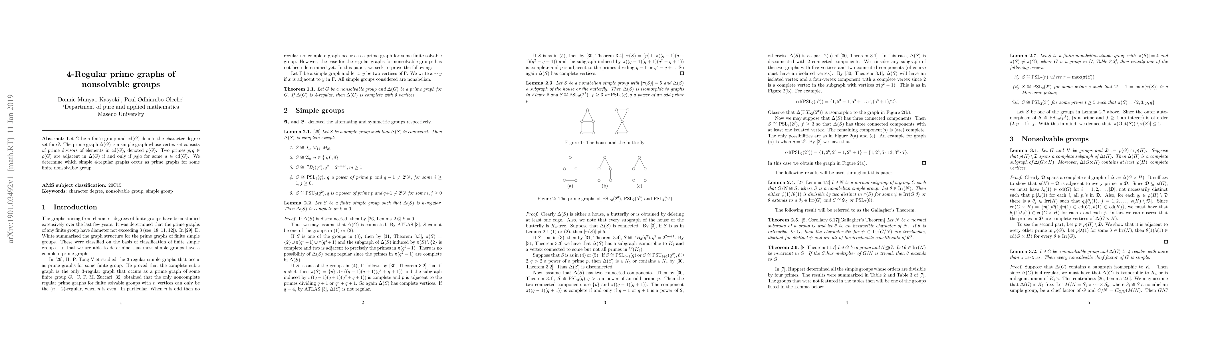 Let $G$ be a finite group and $\text{cd}(G)$ denote the character degree set for $G$. The prime graph $\Delta(G)$ is a simple graph whose vertex set consists of prime divisors of elements in $\text{cd}(G)$, denoted $\rho(G)$. Two primes $p,q\in \rho(G)$ are adjacent in $\Delta(G)$ if and only if $pq|a$ for some $a\in \text{cd}(G)$. We determine which simple 4-regular graphs occur as prime graphs for some finite nonsolvable group.