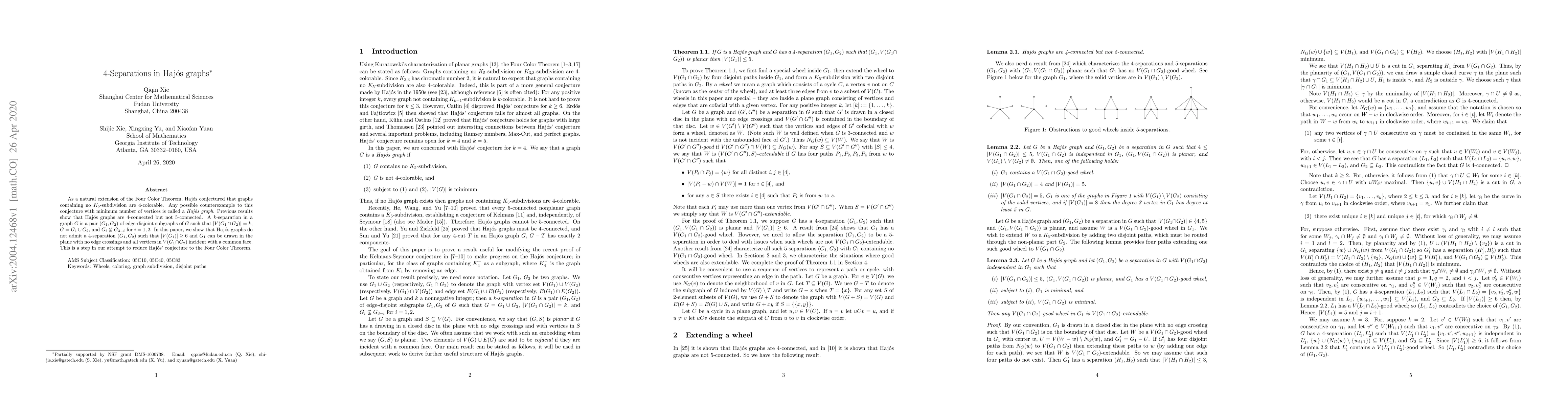 As a natural extension of the Four Color Theorem, Haj\'{o}s conjectured that graphs containing no $K_5$-subdivision are 4-colorable. Any possible counterexample to this conjecture with minimum number of vertices is called a {\it Haj\'{o}s graph}. Previous results show that Haj\'{o}s graphs are 4-connected but not 5-connected. A $k$-separation in a graph $G$ is a pair $(G_1,G_2)$ of edge-disjoint subgraphs of $G$ such that $|V(G_1\cap G_2)|=k$, $G=G_1\cup G_2$, and $G_i\not\subseteq G_{3-i}$ for $i=1,2$. In this paper, we show that Haj\'{o}s graphs do not admit a 4-separation $(G_1,G_2)$ such that $|V(G_1)|\ge 6$ and $G_1$ can be drawn in the plane with no edge crossings and all vertices in $V(G_1\cap G_2)$ incident with a common face. This is a step in our attempt to reduce Haj\'{o}s' conjecture to the Four Color Theorem.