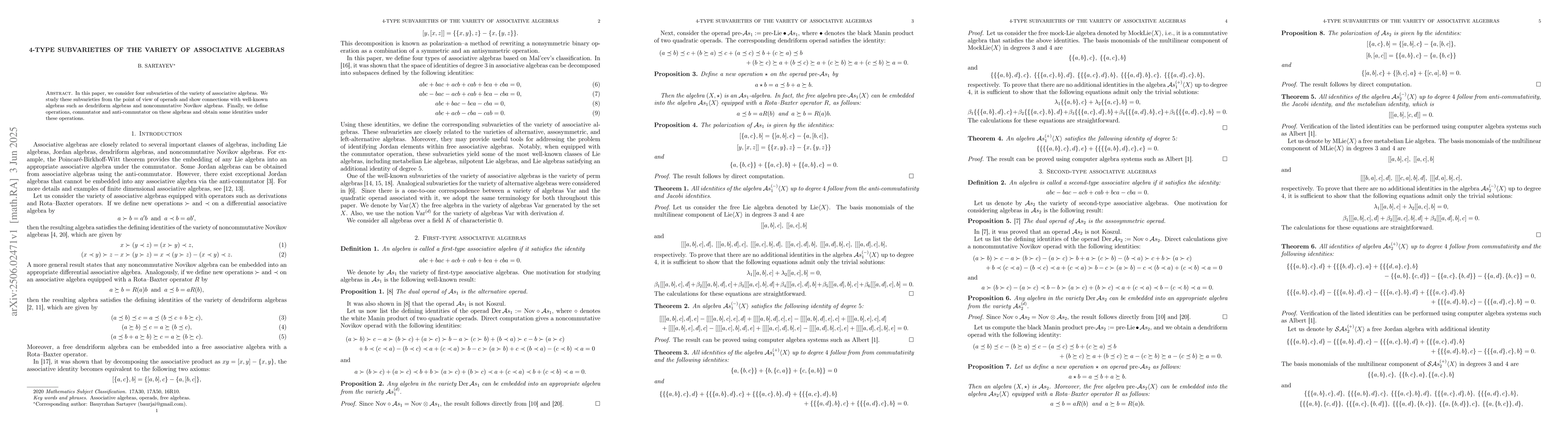 This paper explores four subvarieties within the variety of associative algebras, examining their connections to known algebras like dendriform and noncommutative Novikov algebras via operad theory. It introduces commutator and anti-commutator operations, leading to specific algebraic identities.