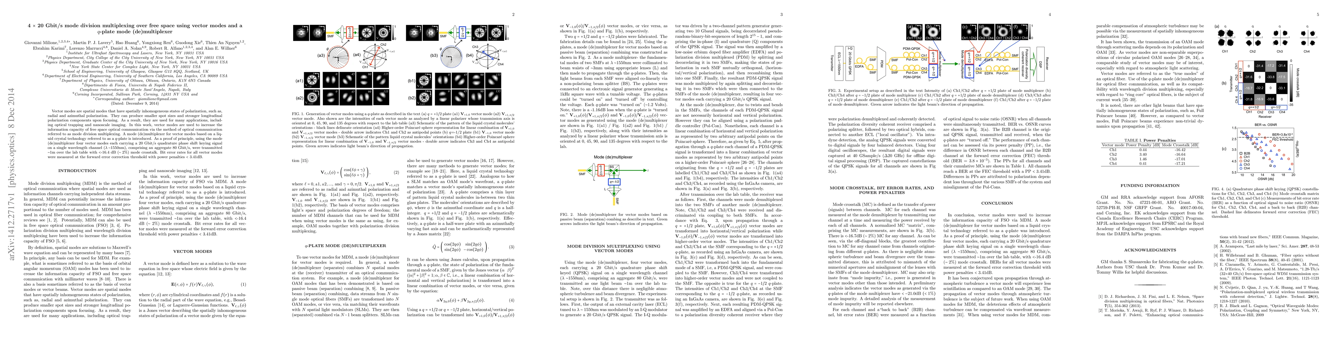 Vector modes are spatial modes that have spatially inhomogeneous states of polarization, such as, radial and azimuthal polarization. They can produce smaller spot sizes and stronger longitudinal polarization components upon focusing. As a result, they are used for many applications, including optical trapping and nanoscale imaging. In this work, vector modes are used to increase the information capacity of free space optical communication via the method of optical communication referred to as mode division multiplexing. A mode (de)multiplexer for vector modes based on a liquid crystal technology referred to as a q-plate is introduced. As a proof of principle, using the mode (de)multiplexer four vector modes each carrying a 20 Gbit/s quadrature phase shift keying signal on a single wavelength channel (~1550nm), comprising an aggregate 80 Gbit/s, were transmitted ~1m over the lab table with <-16.4 dB (<2%) mode crosstalk. Bit error rates for all vector modes were measured at the forward error correction threshold with power penalties < 3.41dB.
