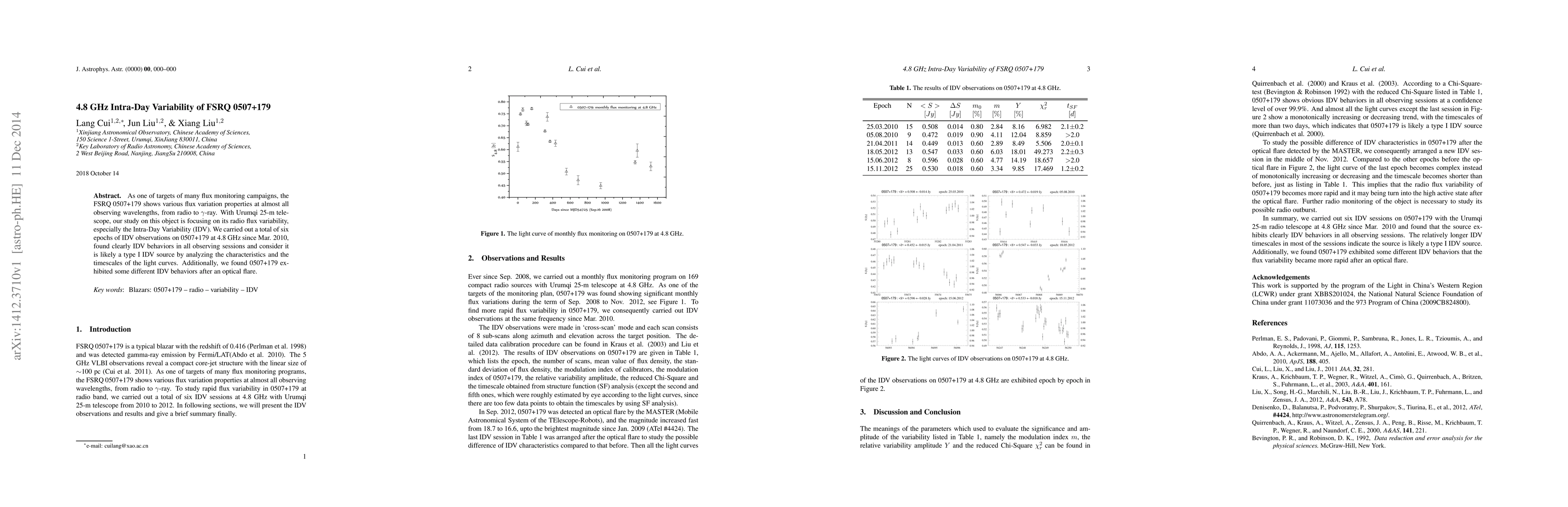 As one of targets of many flux monitoring campaigns, the FSRQ 0507+179 shows various flux variation properties at almost all observing wavelengths, from radio to $\gamma$-ray. With Urumqi 25-m telescope, our study on this object is focusing on its radio flux variability, especially the Intra-Day Variability (IDV). We carried out a total of six epochs of IDV observations on 0507+179 at 4.8 GHz since Mar. 2010, found clearly IDV behaviors in all observing sessions and consider it is likely a type I IDV source by analyzing the characteristics and the timescales of the light curves. Additionally, we found 0507+179 exhibited some different IDV behaviors after an optical flare.