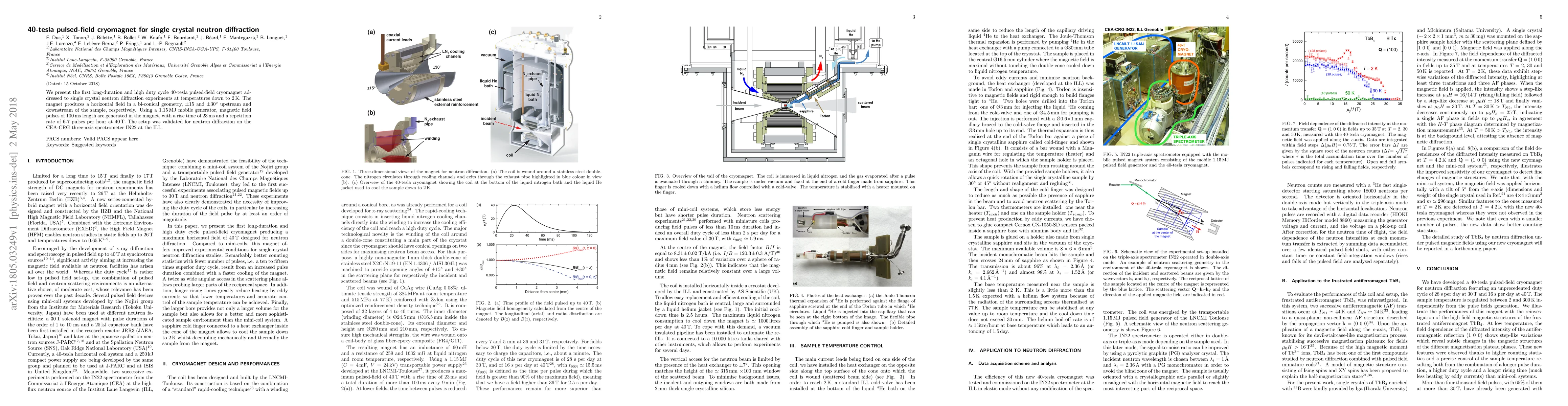 We present the first long-duration and high duty cycle 40-tesla pulsed-field cryomagnet addressed to single crystal neutron diffraction experiments at temperatures down to 2 K. The magnet produces a horizontal field in a bi-conical geometry, $\pm$15 and $\pm$30{\deg} upstream and downstream of the sample, respectively. Using a 1.15MJ mobile generator, magnetic field pulses of 100 ms length are generated in the magnet, with a rise time of 23 ms and a repetition rate of 6-7 pulses per hour at 40 T. The setup was validated for neutron diffraction on the CEA-CRG three-axis spectrometer IN22 at the ILL.