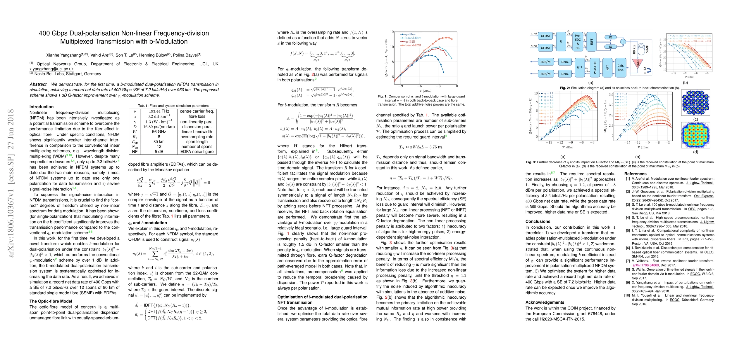 Researchers achieved a record 400 Gbps data rate over 960 km using b-modulation in dual-polarization NFDM transmission, outperforming another scheme by 1 dB Q-factor improvement.