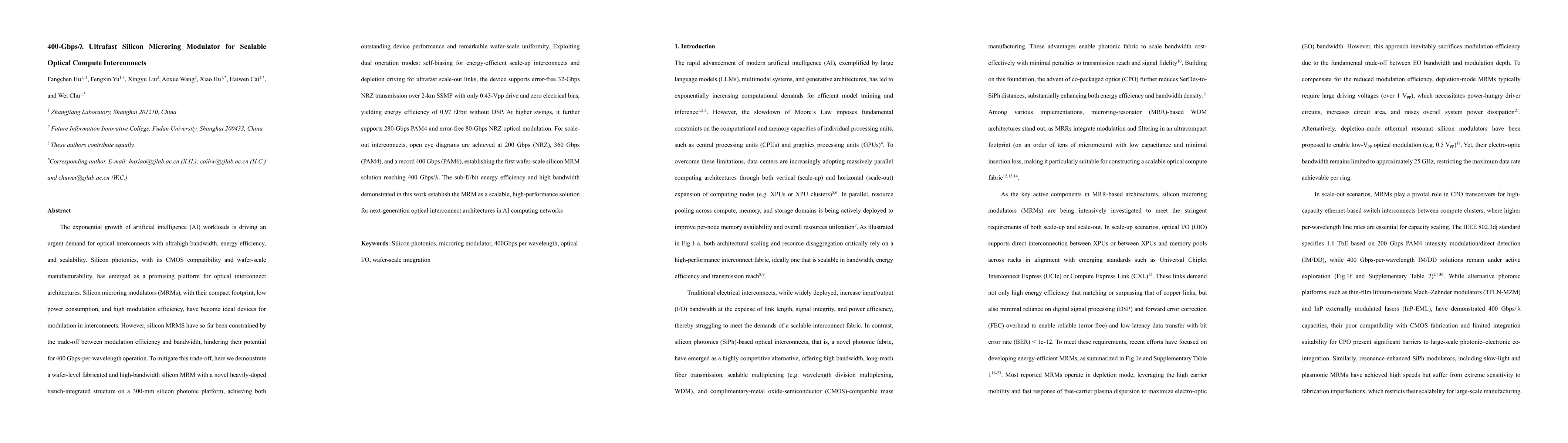 The exponential growth of artificial intelligence (AI) workloads is driving an urgent demand for optical interconnects with ultrahigh bandwidth, energy efficiency, and scalability. Silicon photonics, with its CMOS compatibility and wafer-scale manufacturability, has emerged as a promising platform for optical interconnect architectures. Silicon microring modulators (MRMs), with their compact footprint, low power consumption, and high modulation efficiency, have become ideal devices for modulation in interconnects. However, silicon MRMS have so far been constrained by the trade-off between modulation efficiency and bandwidth, hindering their potential for 400 Gbps-per-wavelength operation. To mitigate this trade-off, here we demonstrate a wafer-level fabricated and high-bandwidth silicon MRM with a novel heavily-doped trench-integrated structure on a 300-mm silicon photonic platform, achieving both outstanding device performance and remarkable wafer-scale uniformity. Exploiting dual operation modes: self-biasing for energy-efficient scale-up interconnects and depletion driving for ultrafast scale-out links, the device supports error-free 32-Gbps NRZ transmission over 2-km SSMF with only 0.43-Vpp drive and zero electrical bias, yielding energy efficiency of 0.97 fJ/bit without DSP. At higher swings, it further supports 280-Gbps PAM4 and error-free 80-Gbps NRZ optical modulation. For scale-out interconnects, open eye diagrams are achieved at 200 Gbps (NRZ), 360 Gbps (PAM4), and a record 400 Gbps (PAM6), establishing the first wafer-scale silicon MRM solution reaching 400 Gbps/$\lambda$. The sub-fJ/bit energy efficiency and high bandwidth demonstrated in this work establish the MRM as a scalable, high-performance solution for next-generation optical interconnect architectures in AI computing networks