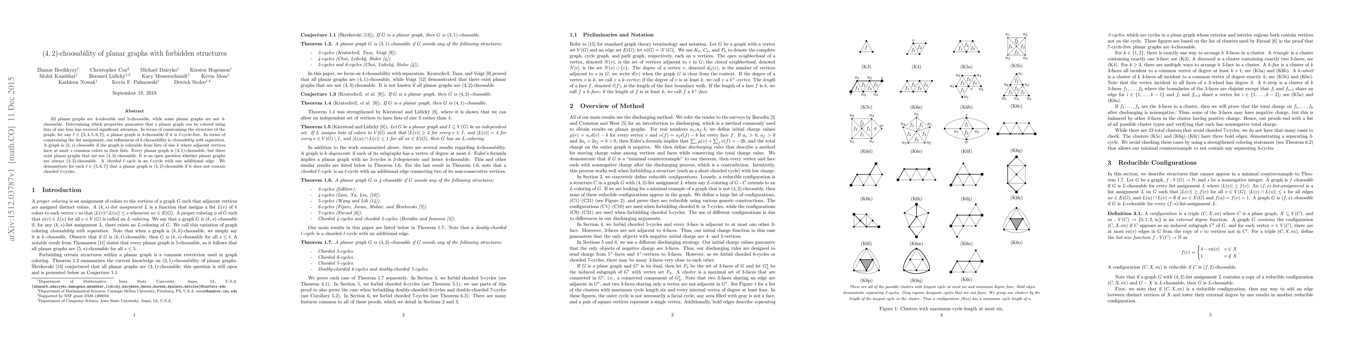 This paper investigates the $(4,2)$-choosability of planar graphs, showing that if a planar graph avoids chorded cycles of lengths 5, 6, or 7, it can always be colored using lists of size four where adjacent vertices share at most two colors. The study contributes to understanding the structural constraints that ensure such choosability in planar graphs.