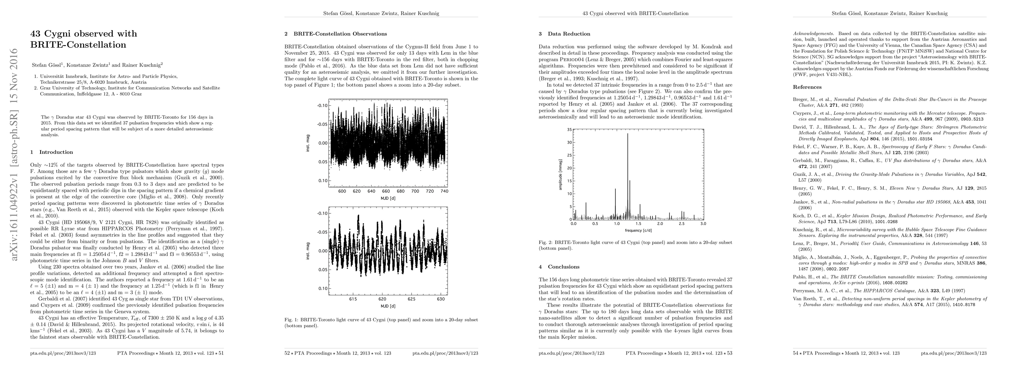 The gamma Doradus star 43 Cygni was observed by BRITE-Toronto for 156 days in 2015. From this data set we identified 37 pulsation frequencies which show a regular period spacing pattern that will be subject of a more detailed asteroseismic analysis.