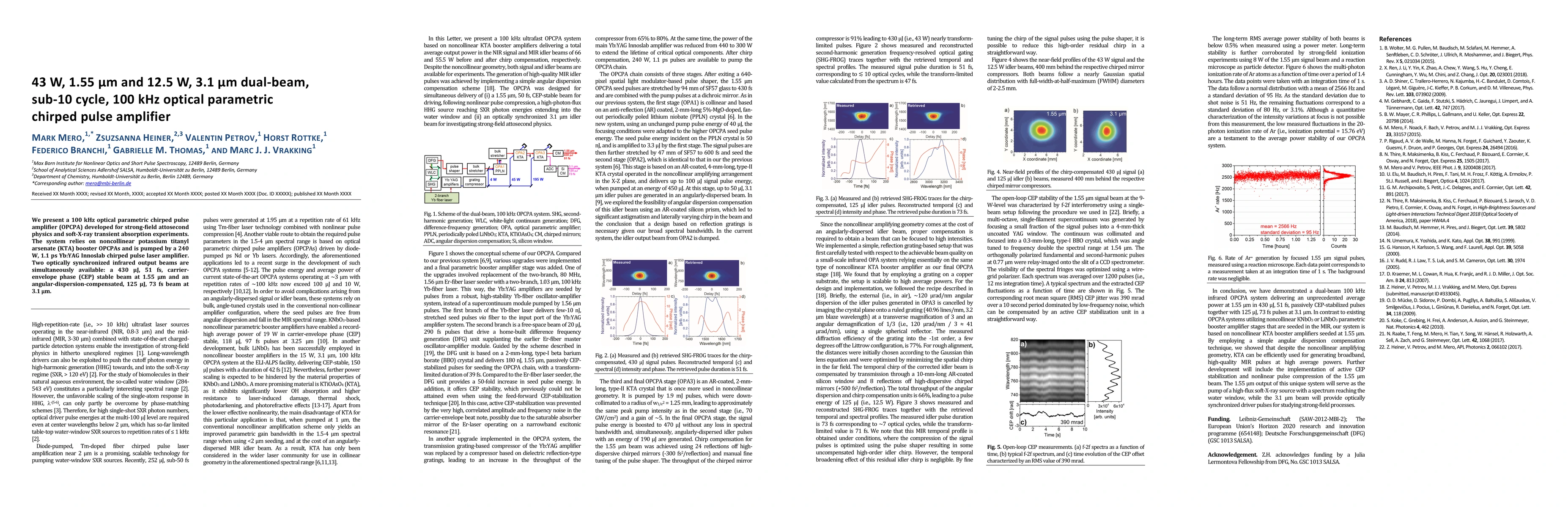 This paper describes a 100 kHz optical parametric chirped pulse amplifier (OPCPA) generating dual-beam outputs: a 430 μJ, 51 fs beam at 1.55 μm and a 125 μJ, 73 fs beam at 3.1 μm, designed for attosecond physics and soft-X-ray experiments. The system uses noncollinear potassium titanyl arsenate (KTA) booster OPCPAs pumped by a 240 W Yb:YAG laser.